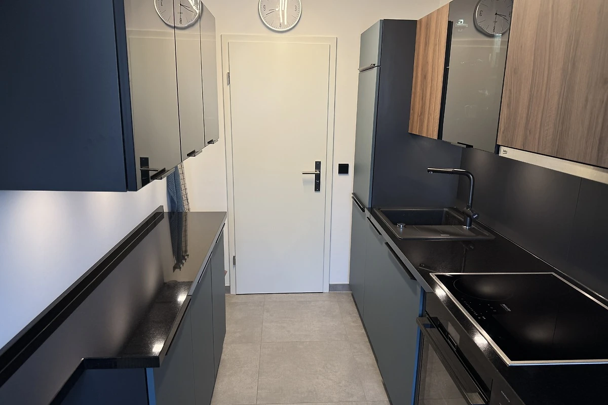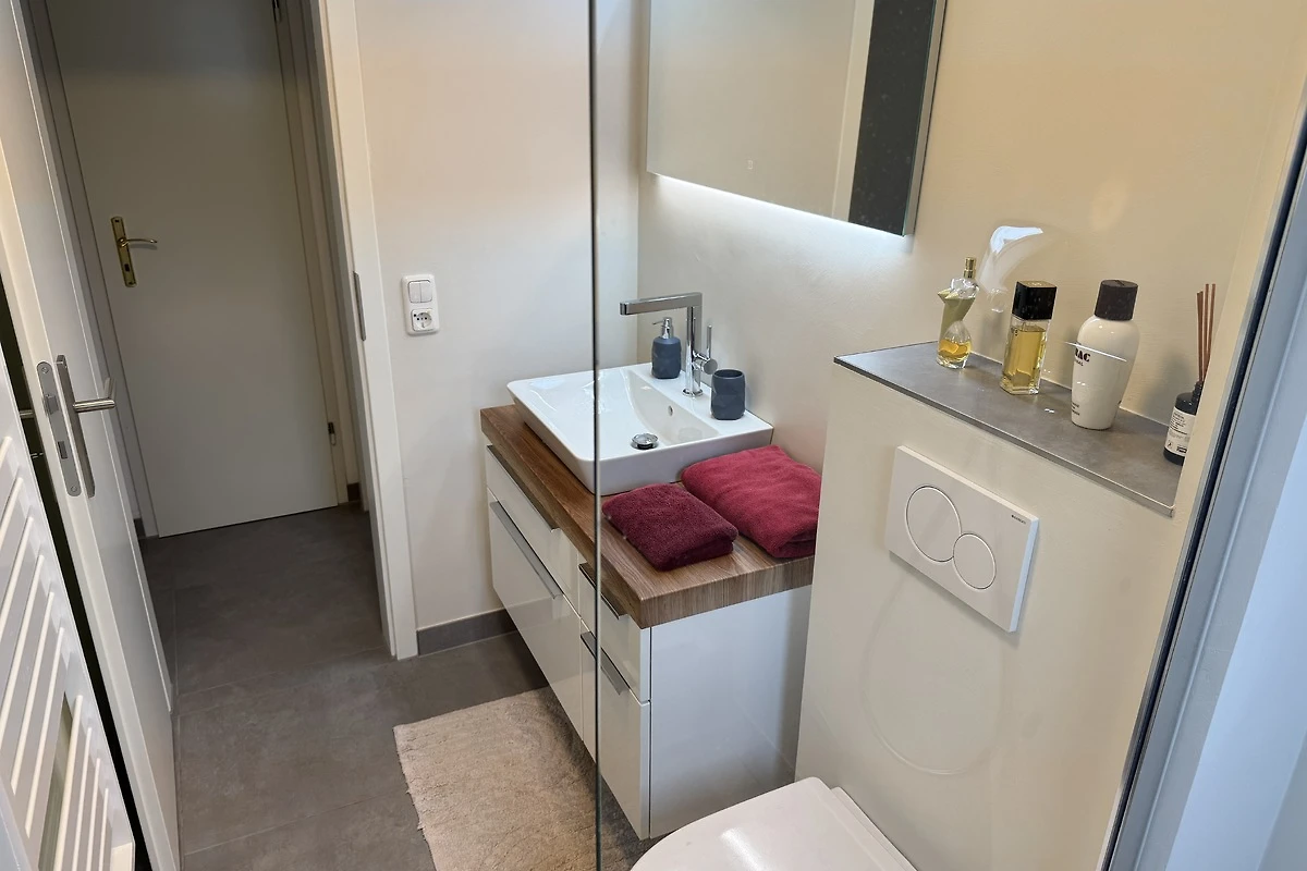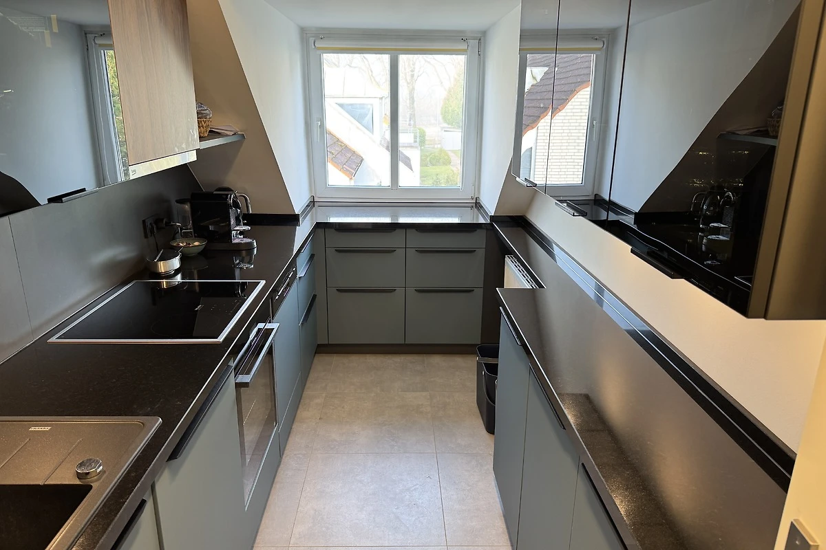 De volledig uitgeruste inbouwkeuken grenst aan de woonkamer, zodat er korte afstanden zijn. De slaapkamer op het noordoosten laat u opstaan met de zon en blijft altijd aangenaam koel, zelfs in hartje zomer. Tussen de iets kleinere kamer en de slaapkamer bevindt zich de badkamer met bad, douche en WC