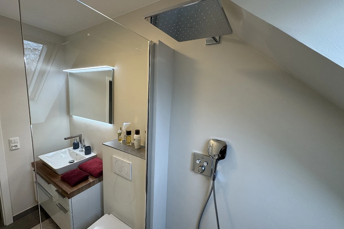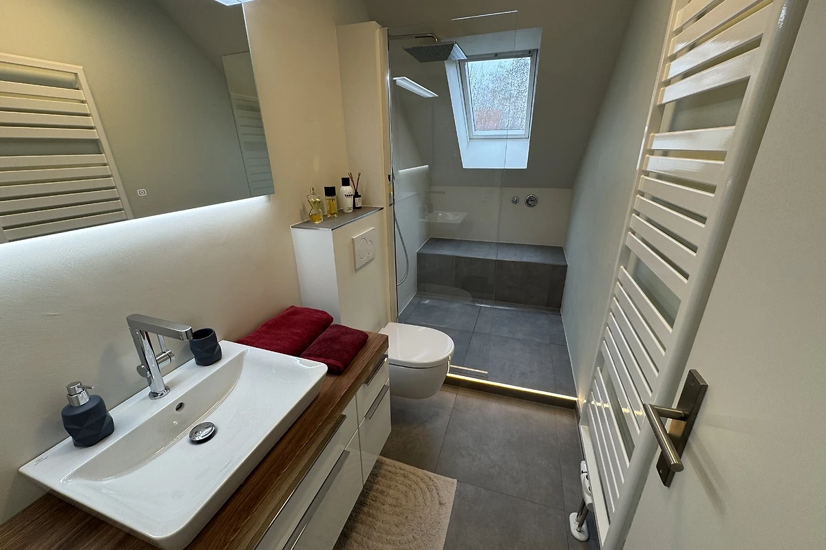 De volledig uitgeruste badkamer omvat een groot bad met douche, WC en wastafel. Een handdoekradiator zorgt voor gezellige warmte. Het dakraam boven het bad zorgt voor helderheid en goede ventilatie.