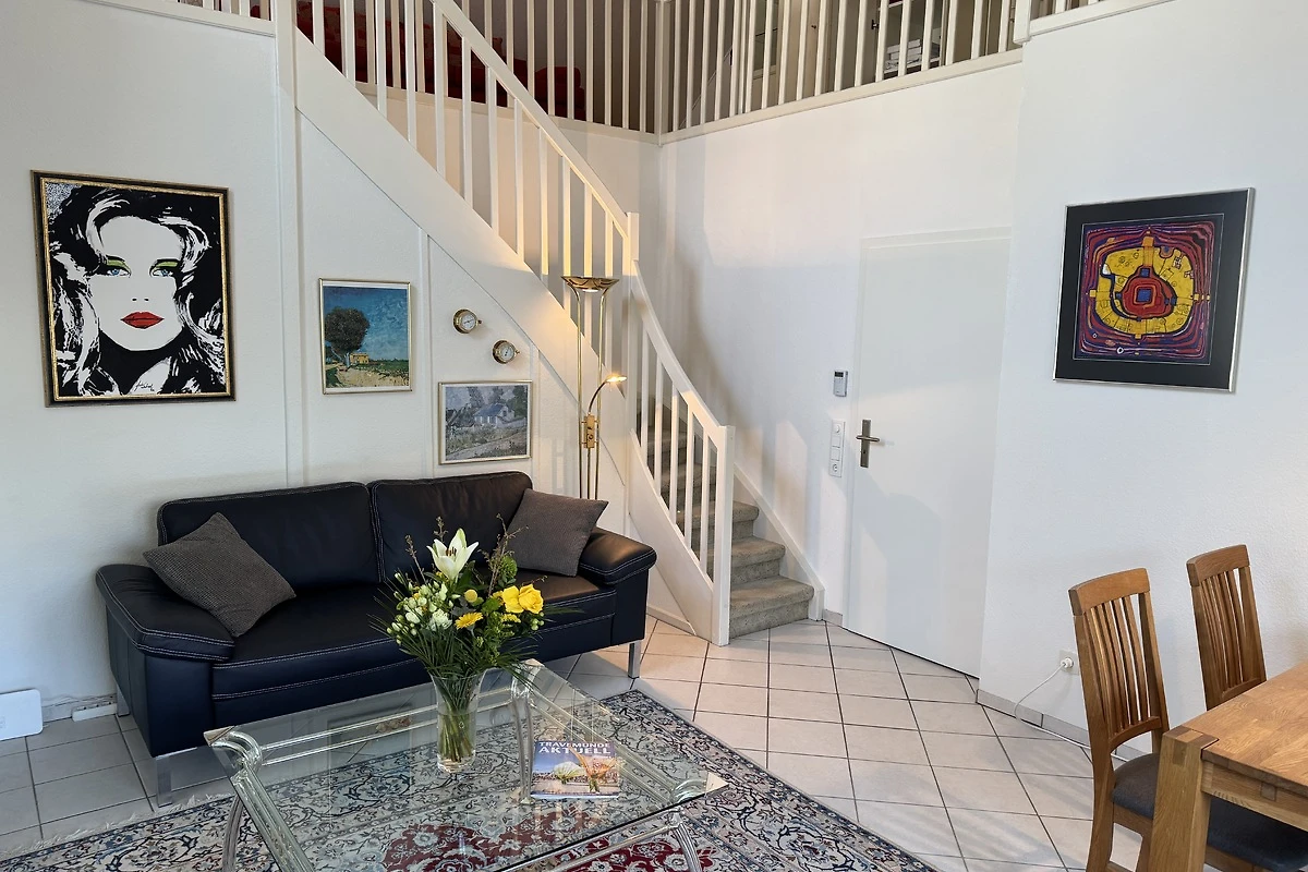 Het middelpunt van de flat is de woonkamer. Vanaf hier leidt de witte massief houten trap naar de galerij