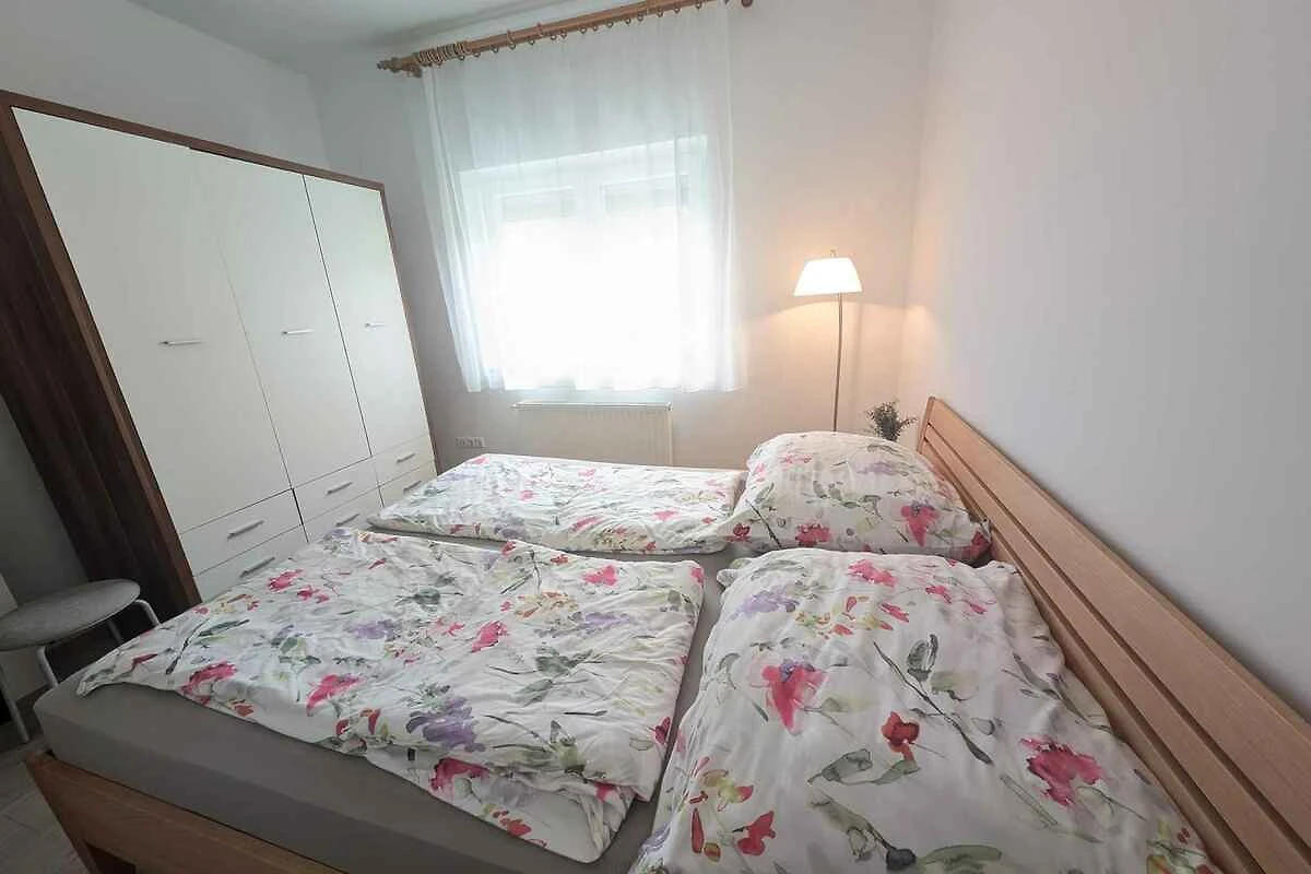 Uw vakantiewoning: Uw vakantiewoning beslaat 1 verdieping, 3 kamers (daarvan 2 slaapkamers), is 75 m² groot en is geschikt voor maximaal 4 personen. Op koude dagen kan uw vakantiewoning verwarmd worden met centrale verwarming (gas). Roken is binnen niet toegestaan. De ingang is im Erdgeschoss en leidt via 2 traptreden direct in het portaal. De indeling van de kamers is als volgt: woonkamer met zithoek, eethoek en TV. De eethoek heeft plaats voor 4 personen. slaapkamer met 1 tweepersoonsbed. slaapkamer met 2 éénpersoonsbedden. keuken met afwasmachine, gasfornuis (4 pitten), bakoven, afzuigkap, koelkast (120 l, vriesvak), magnetron en koffiemachine. badkamer met douche, 1 wastafel en venster. aparte WC met 1 wastafel, WC, venster en wasmachine.