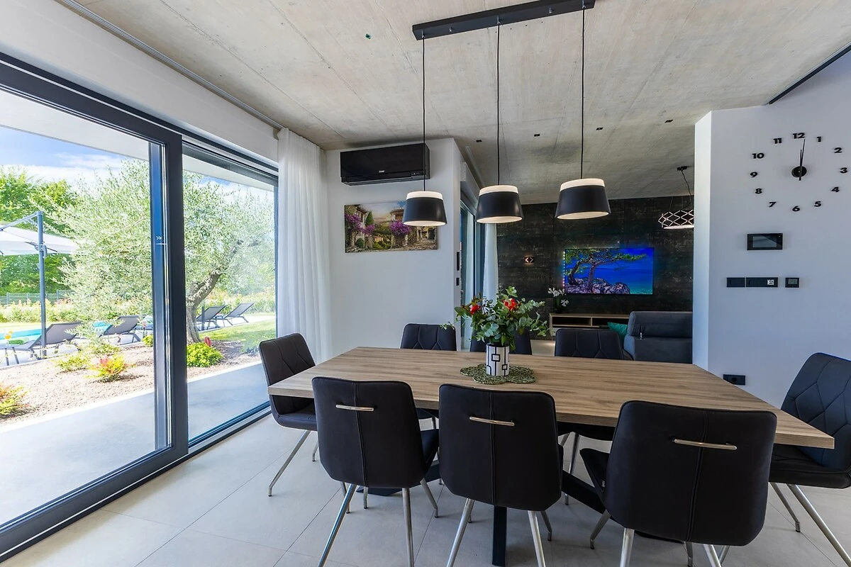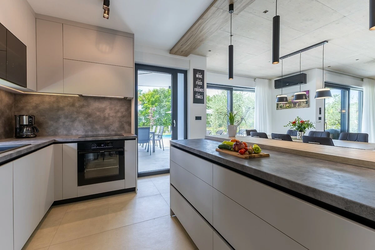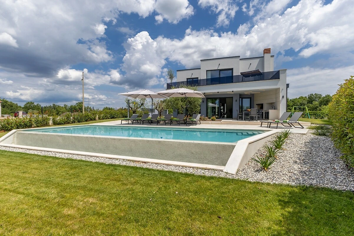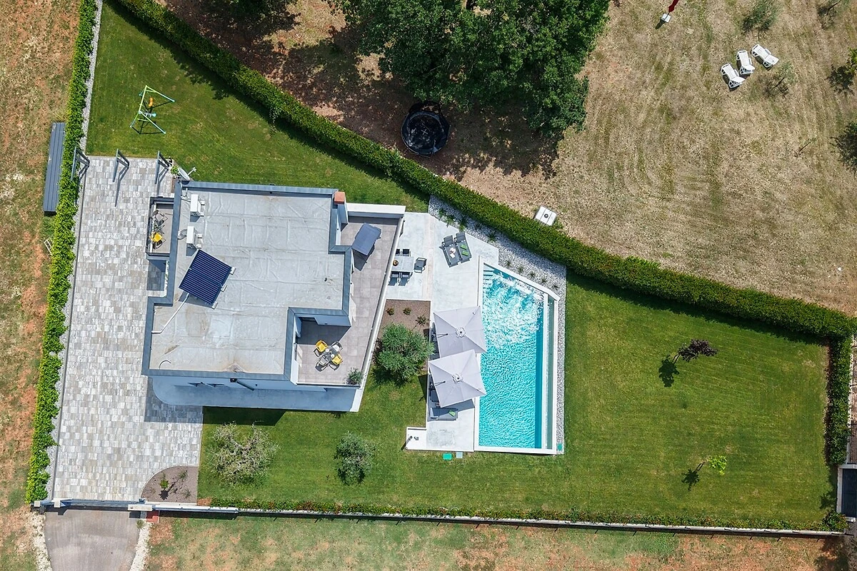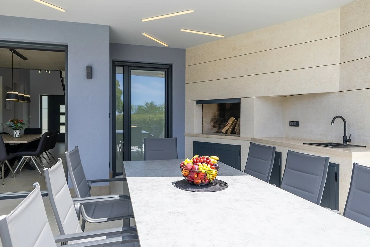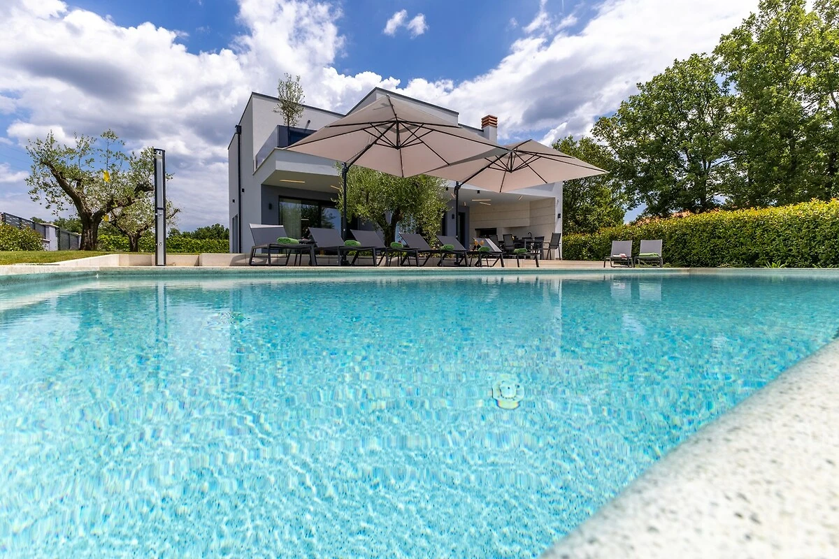 De moderne en exclusief uitgeruste Villa Superiore bevindt zich in het rustige dorp Jakovici bij Tinjan, midden in het groene hart van Istrië. Deze nieuwgebouwde vakantievilla ligt op een volledig omheind perceel in absolute alleenligging en biedt maximale privacy en comfort. De villa beschikt over drie luxueuze, ruime slaapkamers, een moderne, volledig uitgeruste keuken en een elegante woon- en eetkamer met directe toegang tot het terras, de tuin en het infinity-zwembad. Een bijzonder hoogtepunt is de overdekte buitenkeuken – perfect voor gezellige grillavonden onder de sterrenhemel. Dankzij de afgelegen ligging geniet u van absolute rust, maar bent u toch binnen korte tijd bij de mooiste stranden, toprestaurants en wijnroutes van Istrië. Ideaal voor families, stellen of vrienden die een onvergetelijke vakantie in een luxueuze sfeer willen doorbrengen.