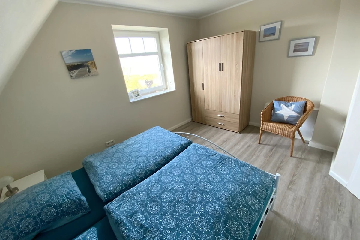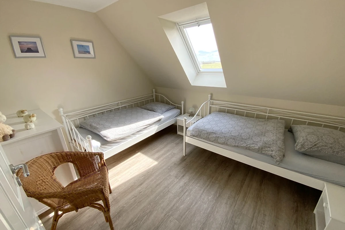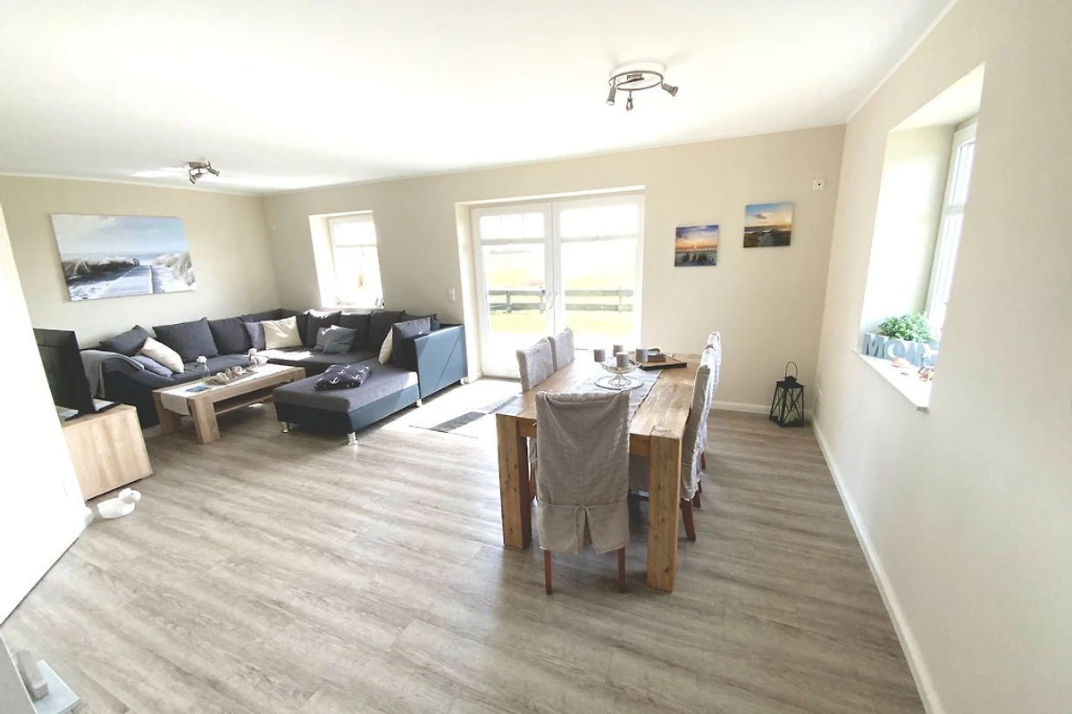 Het is een huis op een fantastisch mooie locatie met een prachtig uitzicht vanaf de terrassen. Elke helft van het huis is uitnodigend groot met 100 m² en biedt ruimte voor een gezin of een vriendelijk stel met elk 3 slaapkamers en 2 badkamers. De omheinde terrassen met gazongedeelte zijn voorzien van tafel, 6 stoelen, parasol, 2 ligbedden, kussens en u heeft een geweldig uitzicht tot aan de Rode Haubarg. Niets dan weidse ruimtes, schapen, lucht en heerlijke rust.