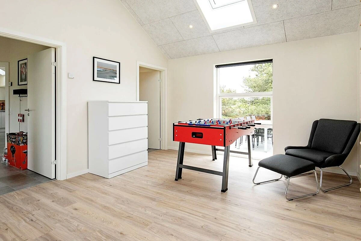 De inrichting is doorlopend modern en huiselijk vormgegeven, het meubilair en de technische uitrusting zijn eigentijds en uitgebreid. Voor de vrijetijdsbesteding is er een grote activiteitenruimte met tafeltennis, tafelvoetbal, enzovoort. Het huis heeft vier slaapkamers met elk twee bedden en een grote loft met twee extra slaapplaatsen. Er zijn twee badkamers, beide met douche en vloerverwarming, waarvan één bovendien met whirlpool. Praktische hulpmiddelen zoals een wasmachine en droger zijn ook aanwezig. Het huis wordt verwarmd met een energiezuinige warmtepomp.