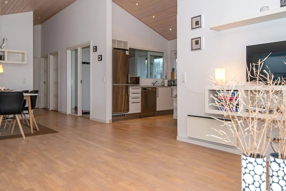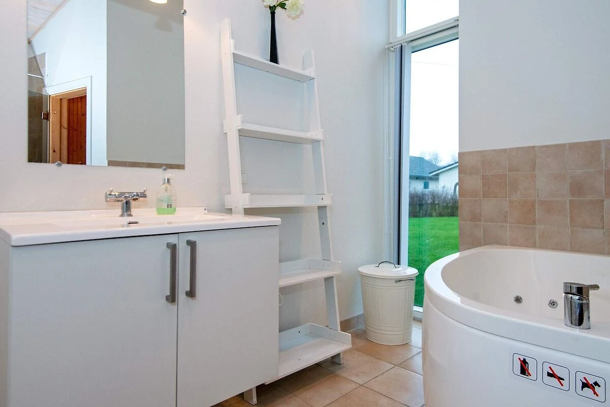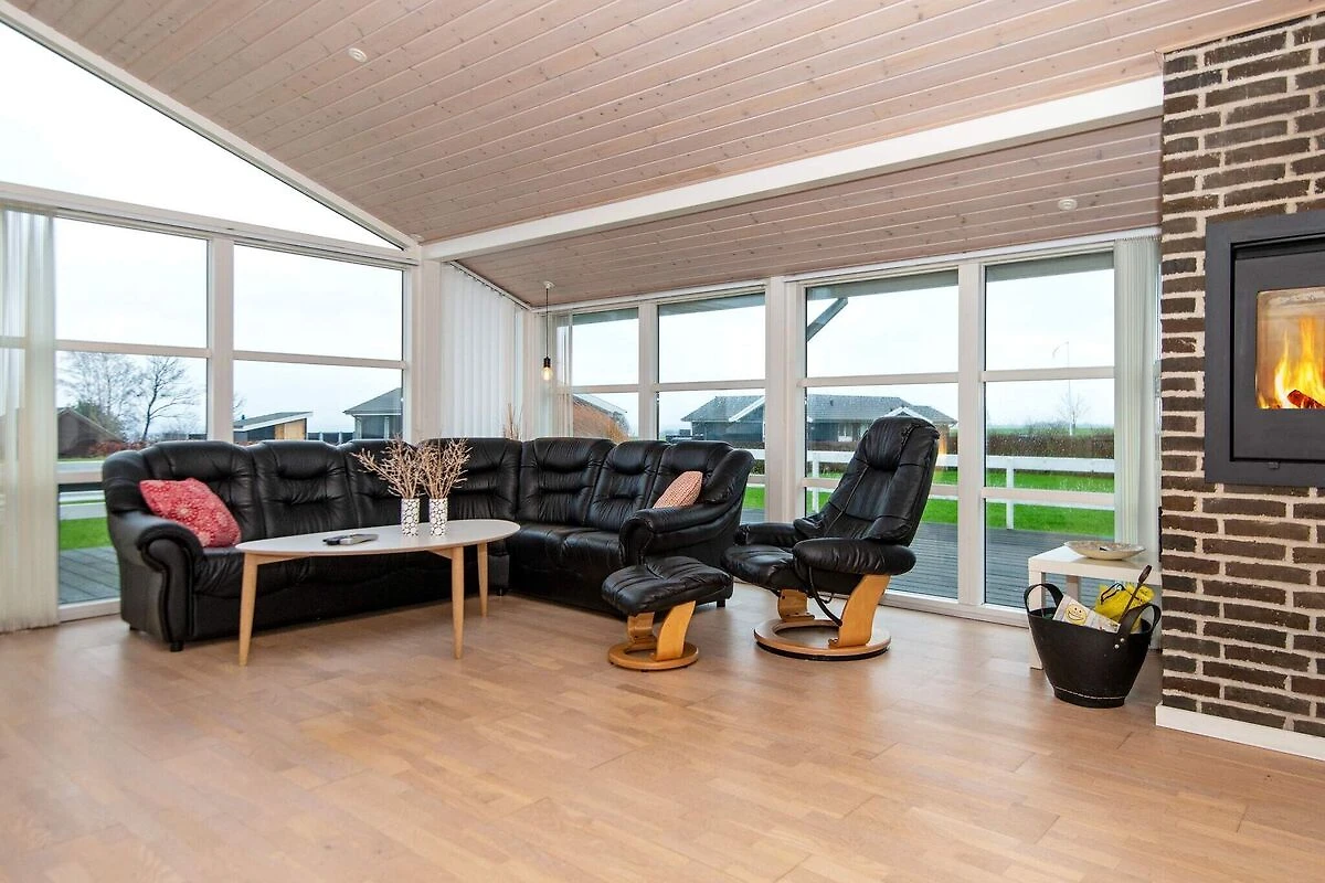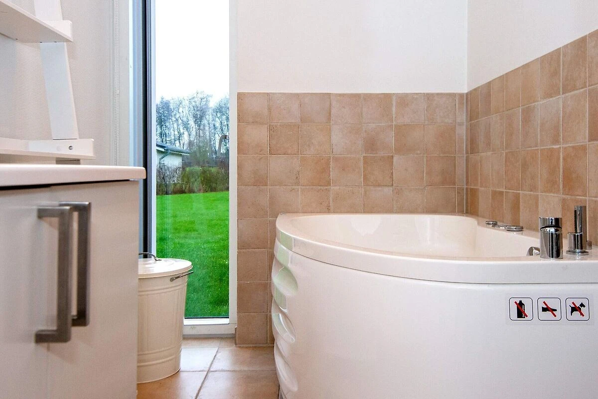 Open keuken(fornuis(elektrisch), afzuigkap, koffiezetapparaat, magnetron, afwasmachine, koelkast, vriezer(140-199L)), woon/slaapkamer(TV(kabel, duitse zender(s), Deense TV zenders (DR1 en TV2)), radio), slaapkamer(2-pers. bed), slaapkamer(2-pers. bed), slaapkamer(2-pers. bed), badkamer(vloerverwarming)(wasdroger, bad of douche, wasbak, toilet, wasmachine), badkamer(bad of douche, wasbak, toilet), spelcomputer, bubbelbad(in huis, verwarmd, 2 personen), sauna(in huis, verwarmd, 4 personen), terras, tuin, aardwarmte