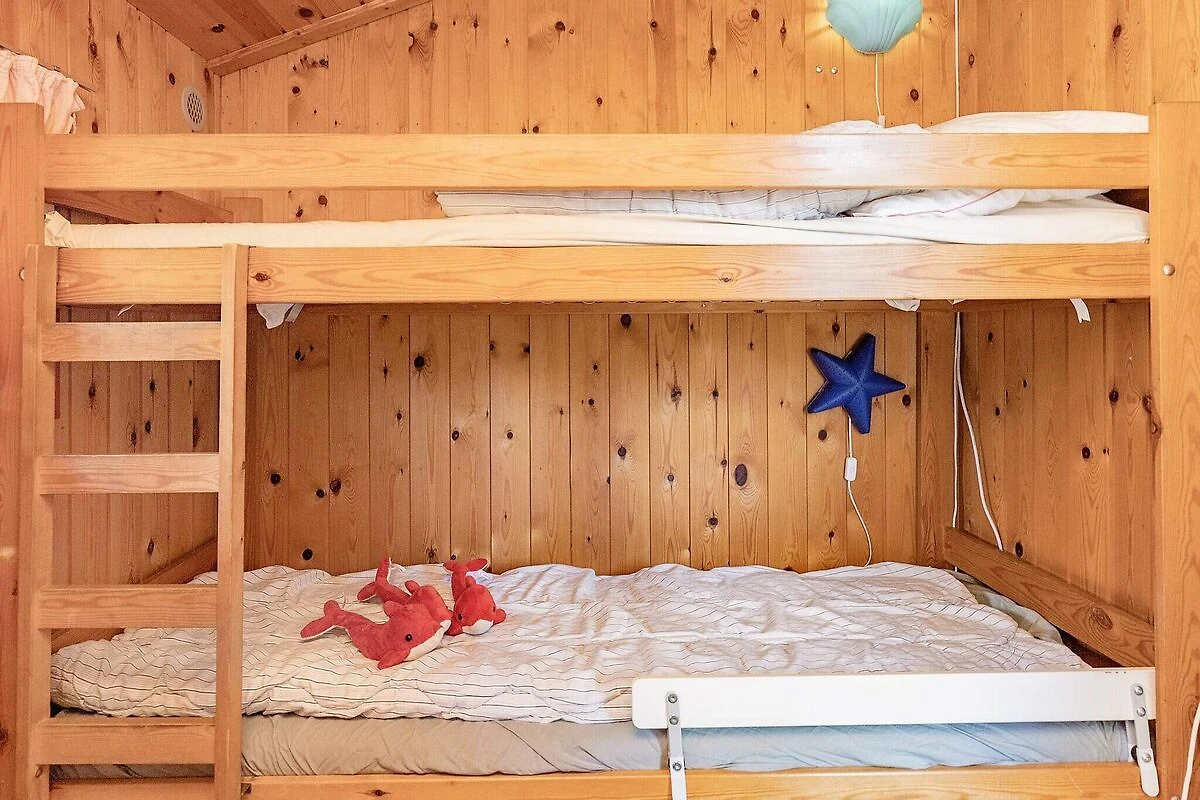 open keuken(fornuis(elektrisch), afzuigkap, koffiezetapparaat, koelkast(+ vriesvak)), woon/slaapkamer, slaapkamer(2-pers. bed), slaapkamer(2x stapelbed), badkamer(bad of douche, wasbak, toilet), verwarming(elektrisch), terras, terras(overdekt), BBQ, speeltoestellen, lucht-lucht warmtepomp