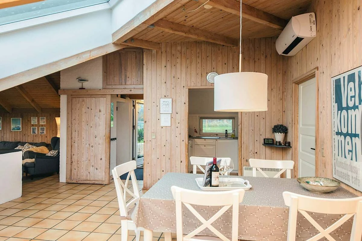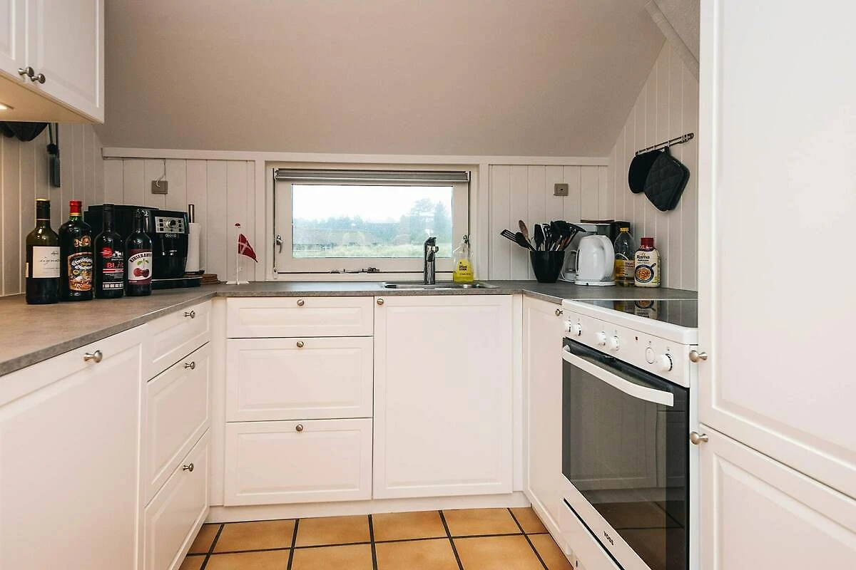 , open keuken(fornuis(elektrisch), afzuigkap, koffiezetapparaat, magnetron, afwasmachine, koelkast(+ vriesvak), wasdroger, wasmachine), woon/slaapkamer(TV(kabel, duitse zender(s), Deense TV zenders (DR1 en TV2)), ledikant, kinderstoel), slaapkamer(2-pers. bed), slaapkamer(2-pers. bed), slaapkamer(2x 1-pers. bed), slaapkamer(2x 1-pers. bed), badkamer(vloerverwarming)(bad of douche, wasbak, toilet), spelcomputer, bubbelbad(in huis, verwarmd), verwarming(elektrisch), terras, tuinmeubilair, lucht-lucht warmtepomp