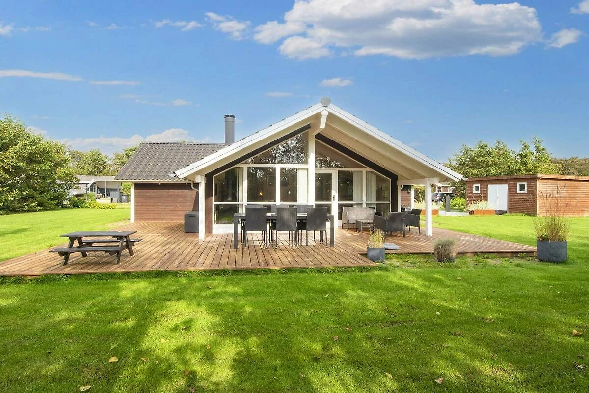 , open keuken(fornuis(elektrisch), afzuigkap, koffiezetapparaat, magnetron, afwasmachine, koel-/vriescombinatie, wasdroger, wasmachine), woon/slaapkamer(TV(satelliet, duitse zender(s), Deense TV zenders (DR1 en TV2)), DVD-speler, CD-speler, stereo-installatie, kinderstoel), slaapkamer(2-pers. bed, ledikant), slaapkamer(2-pers. bed), slaapkamer(2x 1-pers. bed), badkamer(vloerverwarming)(bad of douche, wasbak, toilet), bubbelbad(in huis, verwarmd, 2 personen), sauna(in huis, verwarmd, 2 personen), verwarming(elektrisch), terras, tuin, lucht-lucht warmtepomp