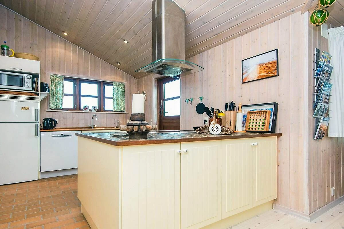 , open keuken(fornuis(elektrisch), afzuigkap, magnetron, afwasmachine, koelkast(+ vriesvak), vriezer(100-139L)), woon/slaapkamer(40 m2)(TV(satelliet, duitse zender(s), Deense TV zenders (DR1 en TV2)), DVD-speler, video, radio, CD-speler), slaapkamer(2-pers. bed), slaapkamer(2x 1-pers. bed), slaapkamer(2x 1-pers. bed), badkamer(vloerverwarming)(wasdroger, bad of douche, wasbak, toilet, wasmachine), badkamer(vloerverwarming)(wasbak, toilet), bubbelbad(in huis, verwarmd, 2 personen), sauna(in huis, verwarmd, 6 personen), verwarming(elektrisch), terras(36 m2), terras(overdekt, 12 m2), Tafel om vis schoon te maken