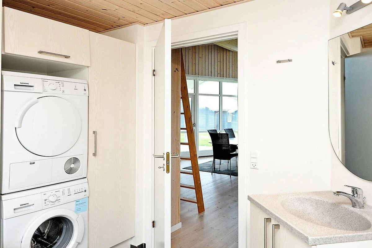 , woonkamer, open keuken(fornuis(elektrisch), afzuigkap, koffiezetapparaat, afwasmachine, koel-/vriescombinatie, wasdroger, wasmachine), woon/slaapkamer(TV(kabel, duitse zender(s), Deense TV zenders (DR1 en TV2)), DVD-speler, radio, CD-speler), slaapkamer(2-pers. bed), slaapkamer(2-pers. bed), slaapkamer(2x 1-pers. bed), badkamer(vloerverwarming)(bad of douche, wasbak, toilet), carport, spelcomputer, bubbelbad(in huis, verwarmd), verwarming(elektrisch), terras(overdekt, 14 m2)