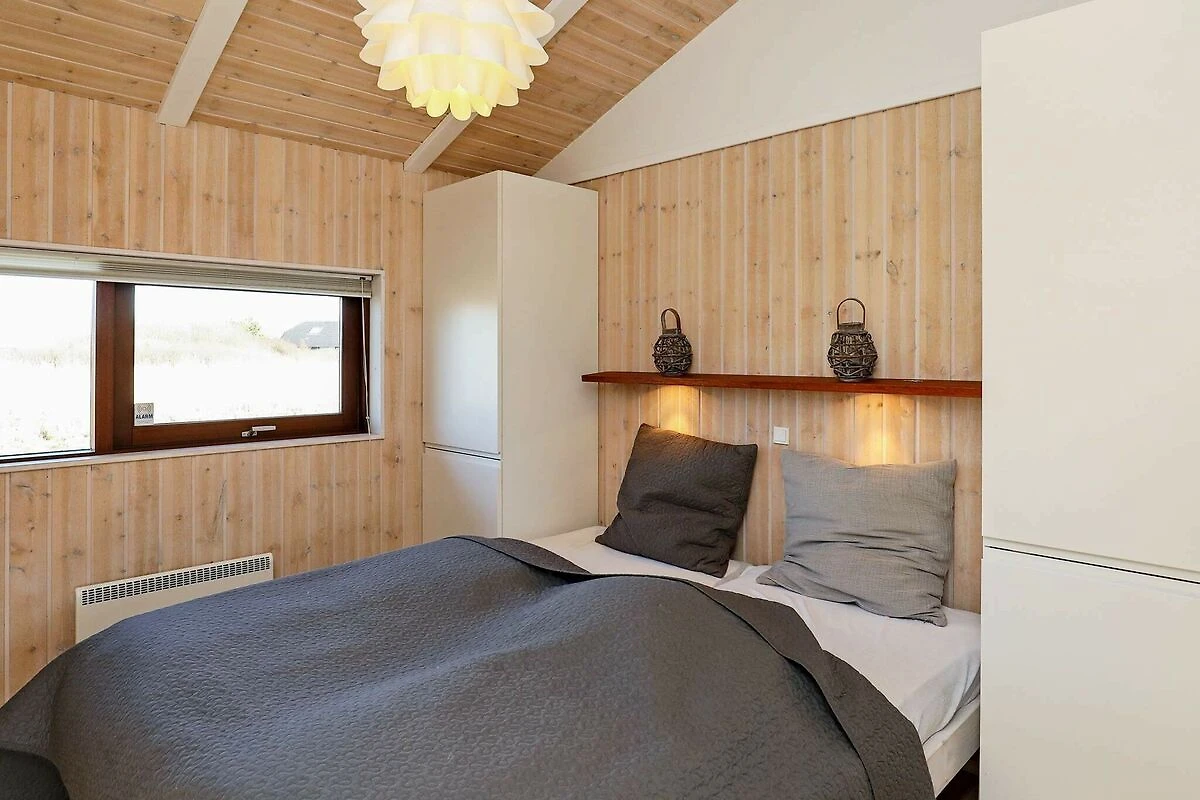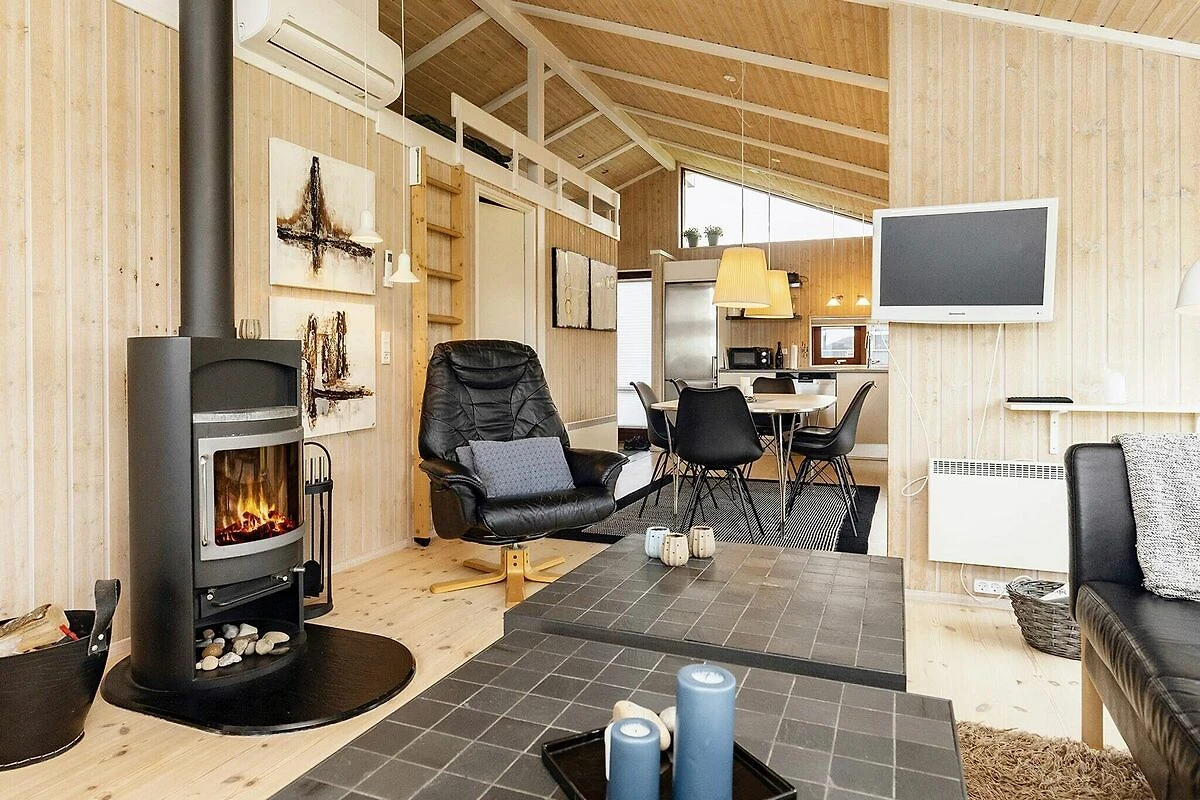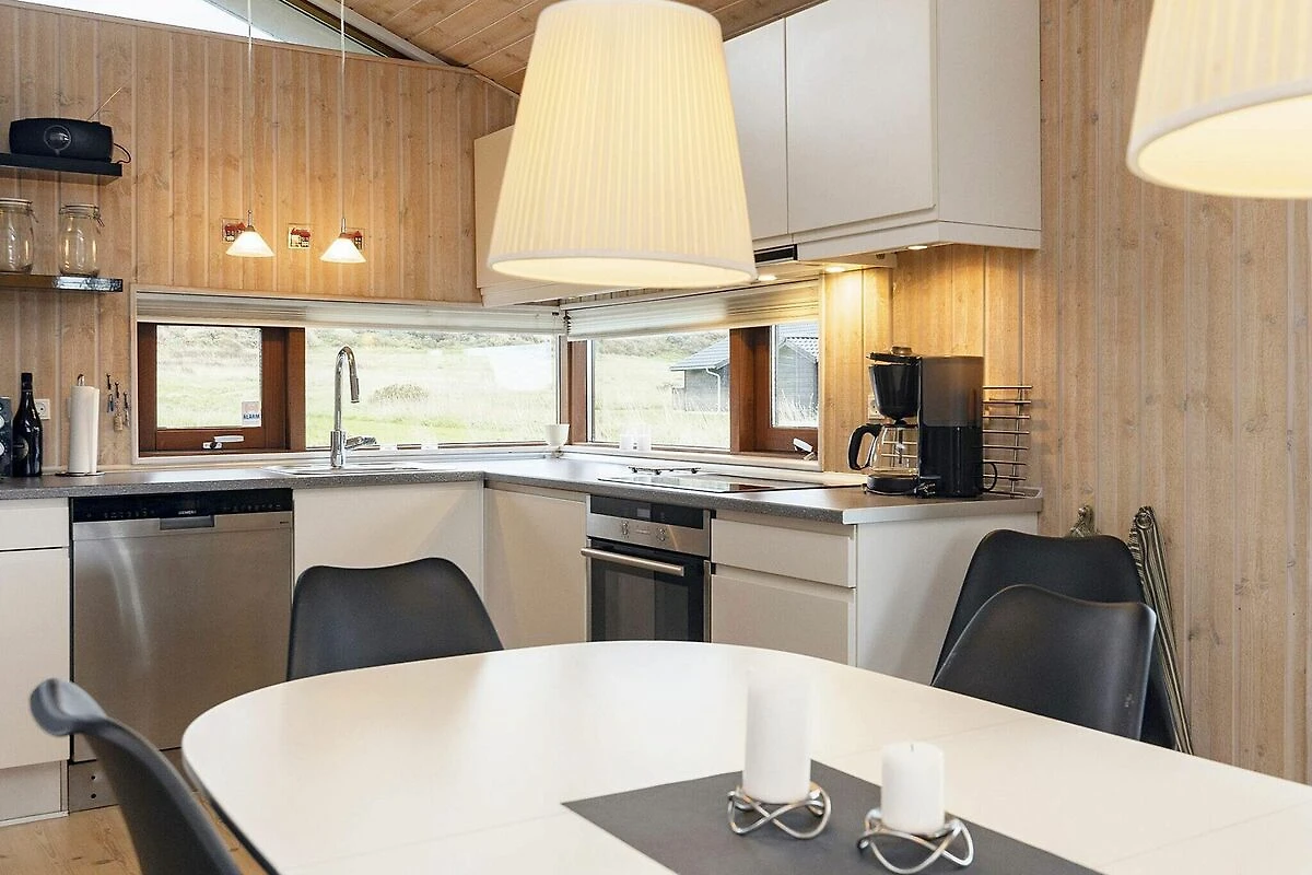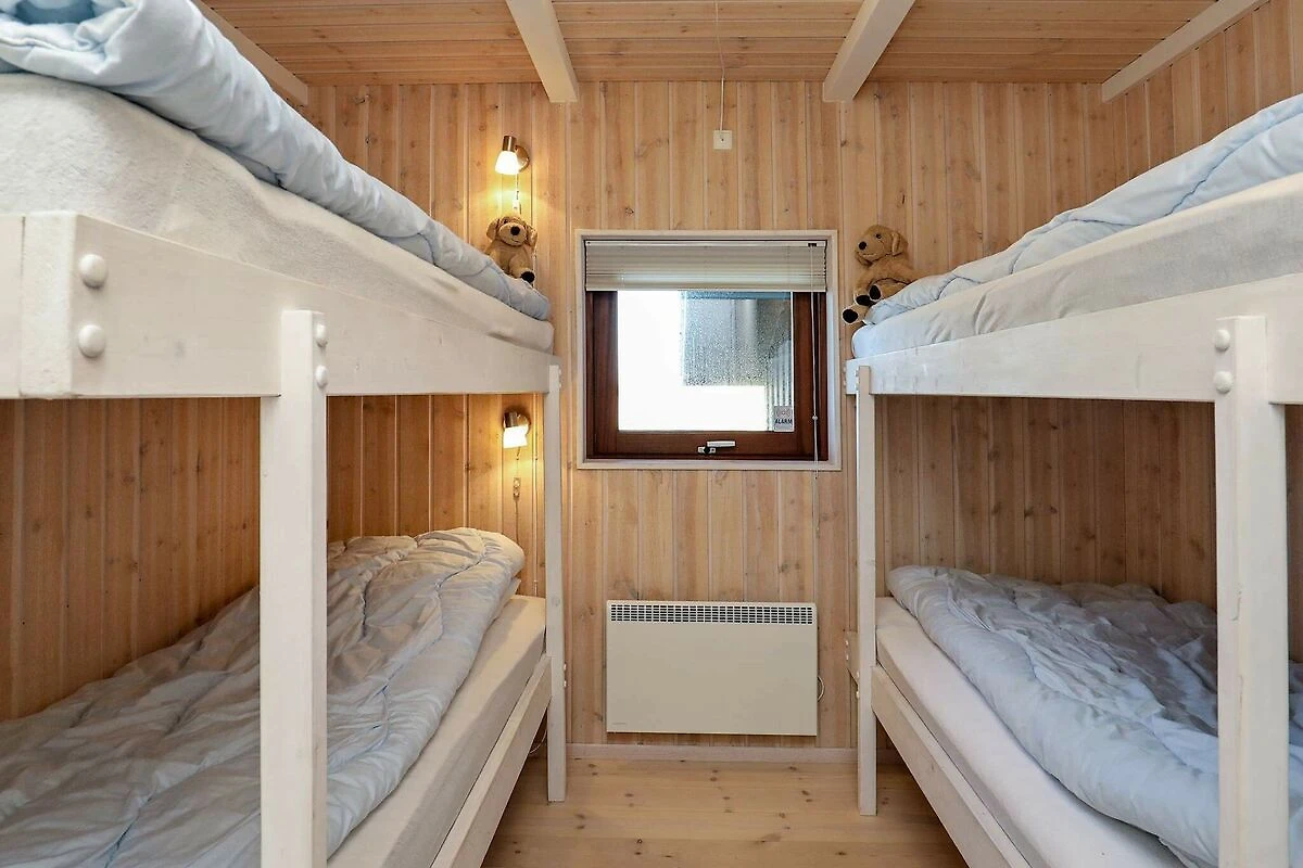 Open keuken(fornuis(elektrisch), afzuigkap, koffiezetapparaat, magnetron, afwasmachine, koel-/vriescombinatie, wasdroger, wasmachine), woon/slaapkamer(TV(kabel, duitse zender(s), Deense TV zenders (DR1 en TV2)), CD-speler, stereo-installatie, kinderstoel), slaapkamer(2-pers. bed, kinderbed), slaapkamer(2-pers. bed), slaapkamer(4x stapelbed), badkamer(vloerverwarming)(bad of douche, wasbak, toilet), bubbelbad(in huis, verwarmd, 2 personen), sauna(in huis, verwarmd, 4 personen), verwarming(elektrisch), terras, terras(overdekt), speeltoestellen, lucht-lucht warmtepomp