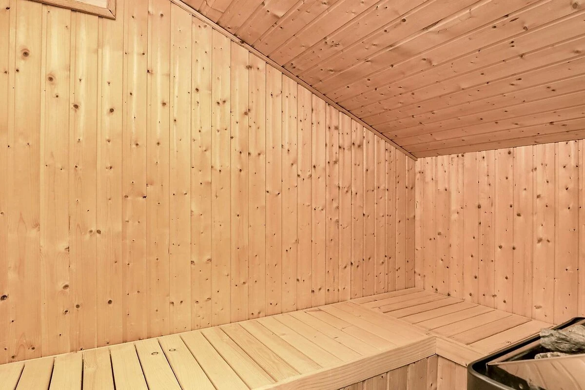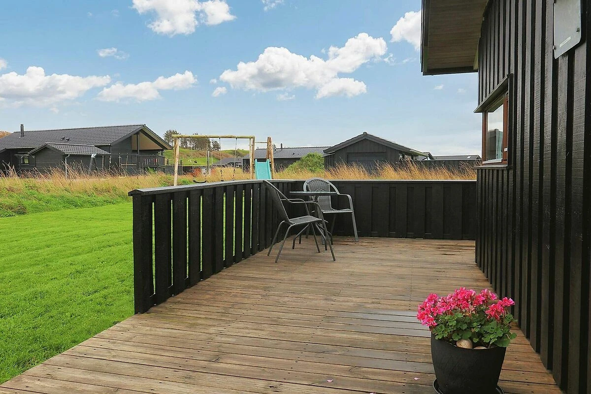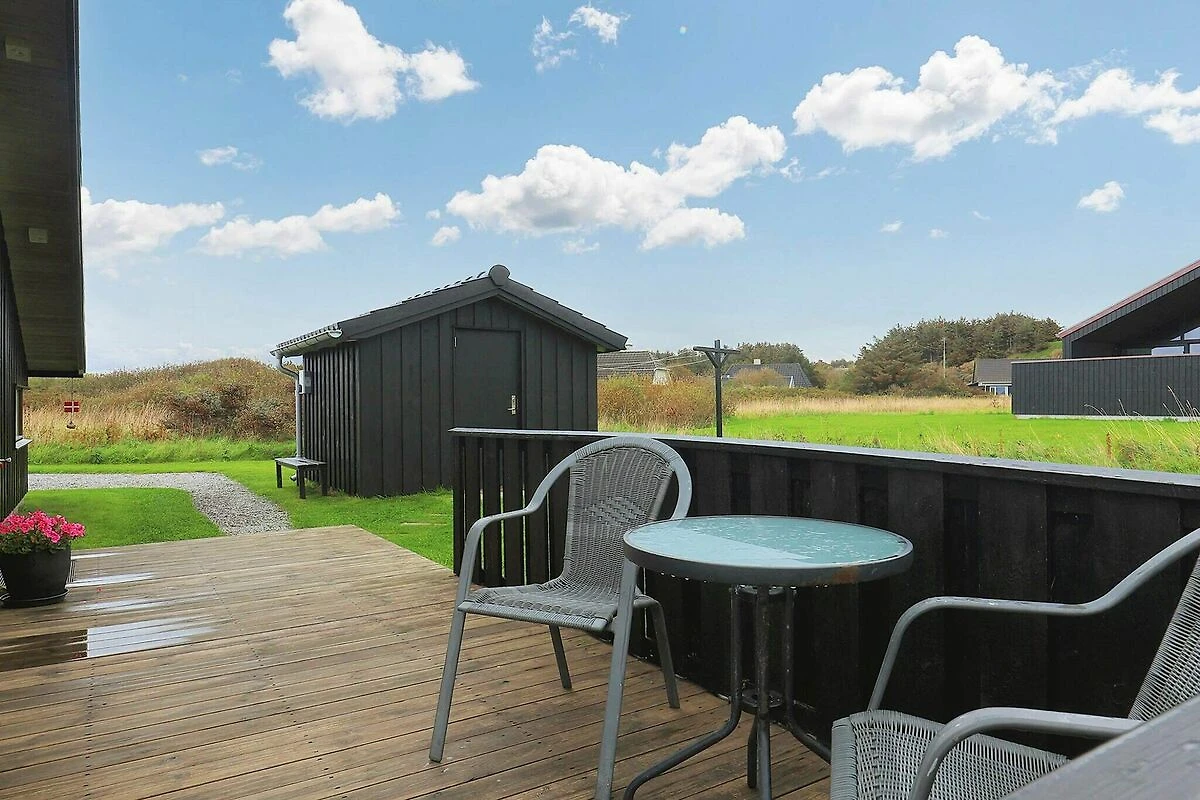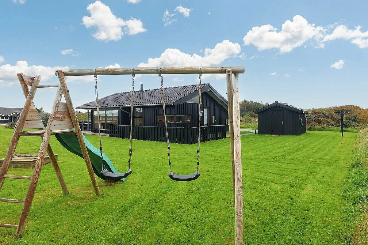 Open keuken(fornuis(elektrisch), afzuigkap, koffiezetapparaat, magnetron, afwasmachine, koel-/vriescombinatie, wasdroger, wasmachine), woon/slaapkamer(TV(kabel, duitse zender(s), Deense TV zenders (DR1 en TV2)), CD-speler, stereo-installatie, kinderstoel), slaapkamer(2-pers. bed, kinderbed), slaapkamer(2-pers. bed), slaapkamer(4x stapelbed), badkamer(vloerverwarming)(bad of douche, wasbak, toilet), bubbelbad(in huis, verwarmd, 2 personen), sauna(in huis, verwarmd, 4 personen), verwarming(elektrisch), terras, terras(overdekt), speeltoestellen, lucht-lucht warmtepomp