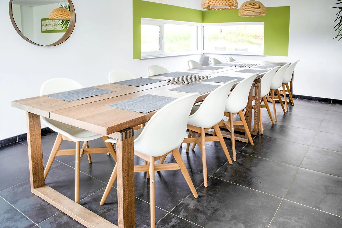 's Avonds eet je met het hele gezelschap aan de grote eettafel, die je later op de avond omtovert in een biljarttafel! In de tuin kun je een vleesje braden op de barbecue, terwijl de kinderen van de ruimte genieten. Wil je je paard mee? Dat kan! Voor € 1,- per paard per nacht staat je paard in de paardenstal.