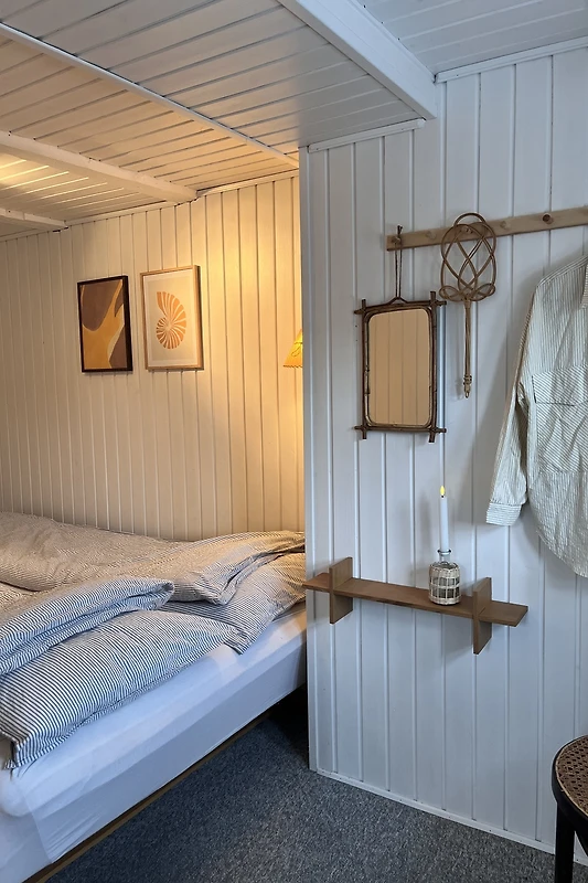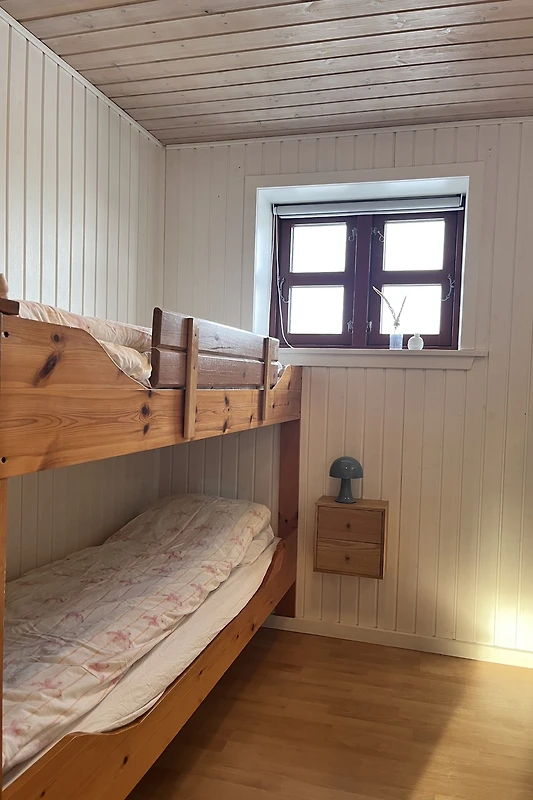 Keuken, slaapkamer met tweepersoonsbed en slaapruimte met stapelbedden en 1 vide met plaats voor 2 personen.