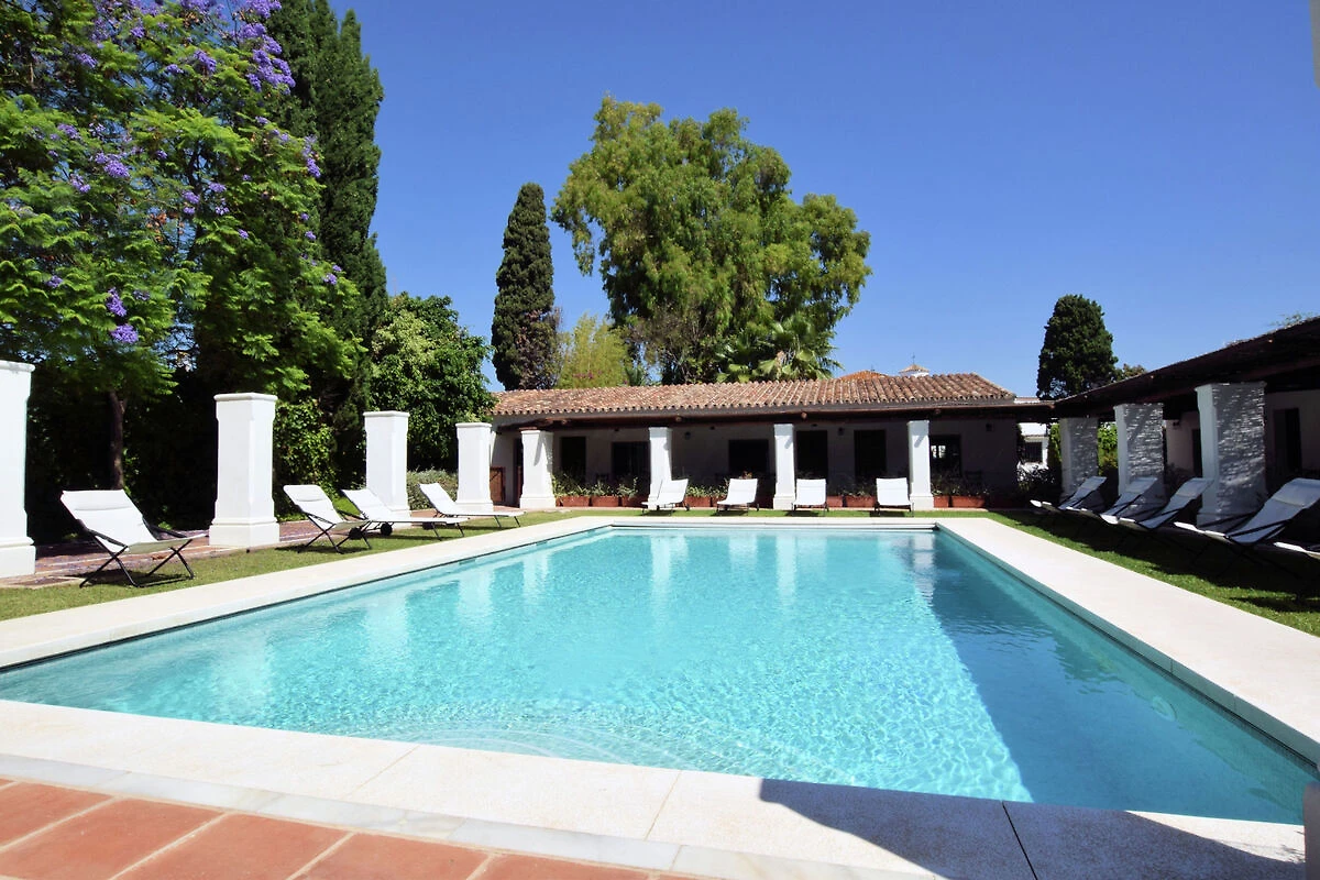 Deze Andalusische villa in San Pedro de Alcántara biedt comfortabel plaats aan maximaal 15 gasten, verdeeld over 8 slaapkamers, waardoor het ideaal is voor grote gezinnen of groepen. De accommodatie beschikt over een verwarmd, overdekt privézwembad, een omheinde tuin met barbecuefaciliteiten en een speelkamer met pooltafel en tafeltennistafel. Veel onderling verbonden kamers creëren een perfecte omgeving voor familiebijeenkomsten, terwijl airconditioning en vloerverwarming het hele jaar door comfort garanderen. Overdekte terrassen bieden schaduwrijke ontspanningsmogelijkheden en uitzicht op het omliggende landschap van de Costa del Sol. Toegang tot strand en activiteiten