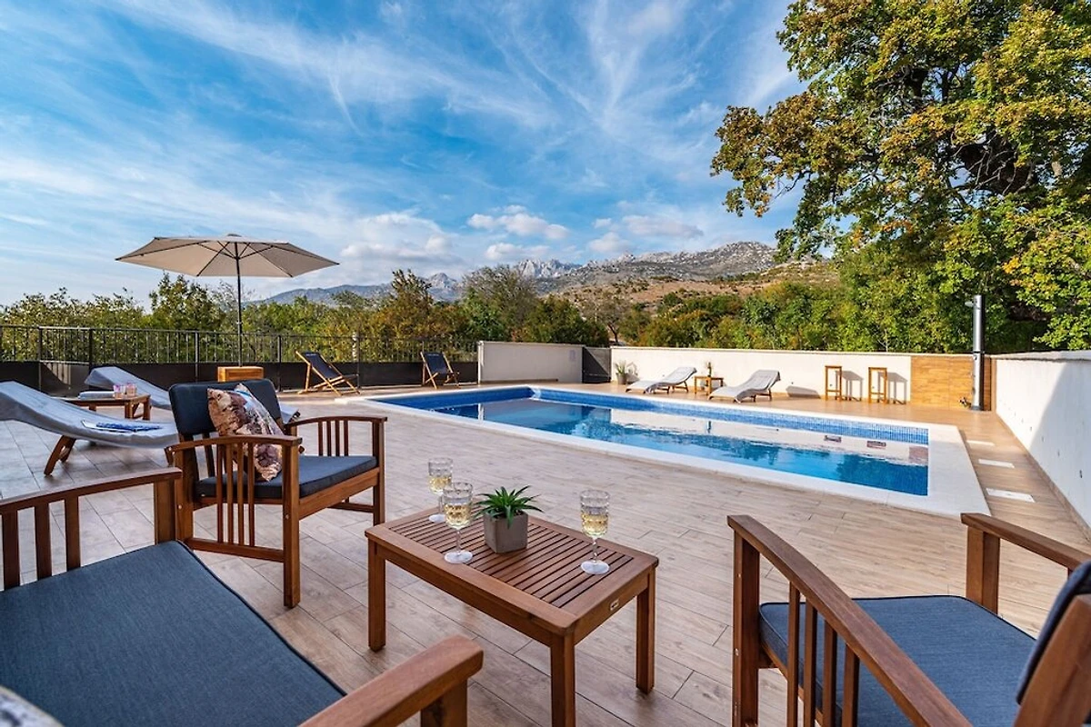 Het privézwembad was een hoogtepunt voor ontspannen middagen, Het terras bood een prachtig uitzicht op de bergen