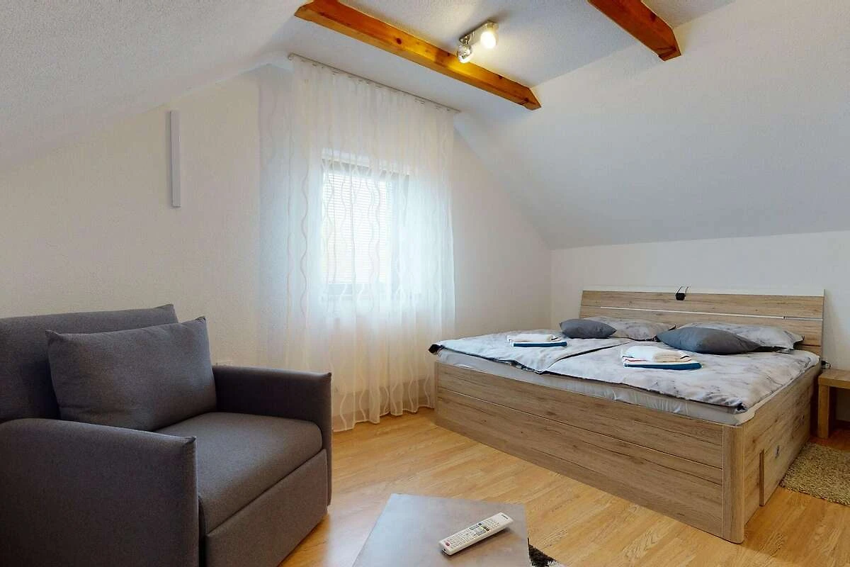 We werden zeer vriendelijk ontvangen door de eigenaresse. Zij sprak redelijk Engels. Accommodatie was prima. Lekkere tuin voor de deur als extra. Woonkamer/keuken niet erg groot. Maar als het mooi weer is zit je ook niet binnen. Slaapkamer en badkamer voldoet. Helaas wel een douchegordijn, wat ik zelf niet echt fijn vind. Ze hebben last van boktorren in het plafond. Die kun je wel horen 's nachts (knagend geluid). Eigenaresse gaf aan dat zodra de woning niet meer verhuurt was, zij dit ging behandelen. Omgeving: er wordt heel veel gebouwd in de directe omgeving. Je hebt er echter geen geluidsoverlast van. Het dorp is duidelijk groeiende. Weinig winkels en eetgelegenheden in de directe omgeving.