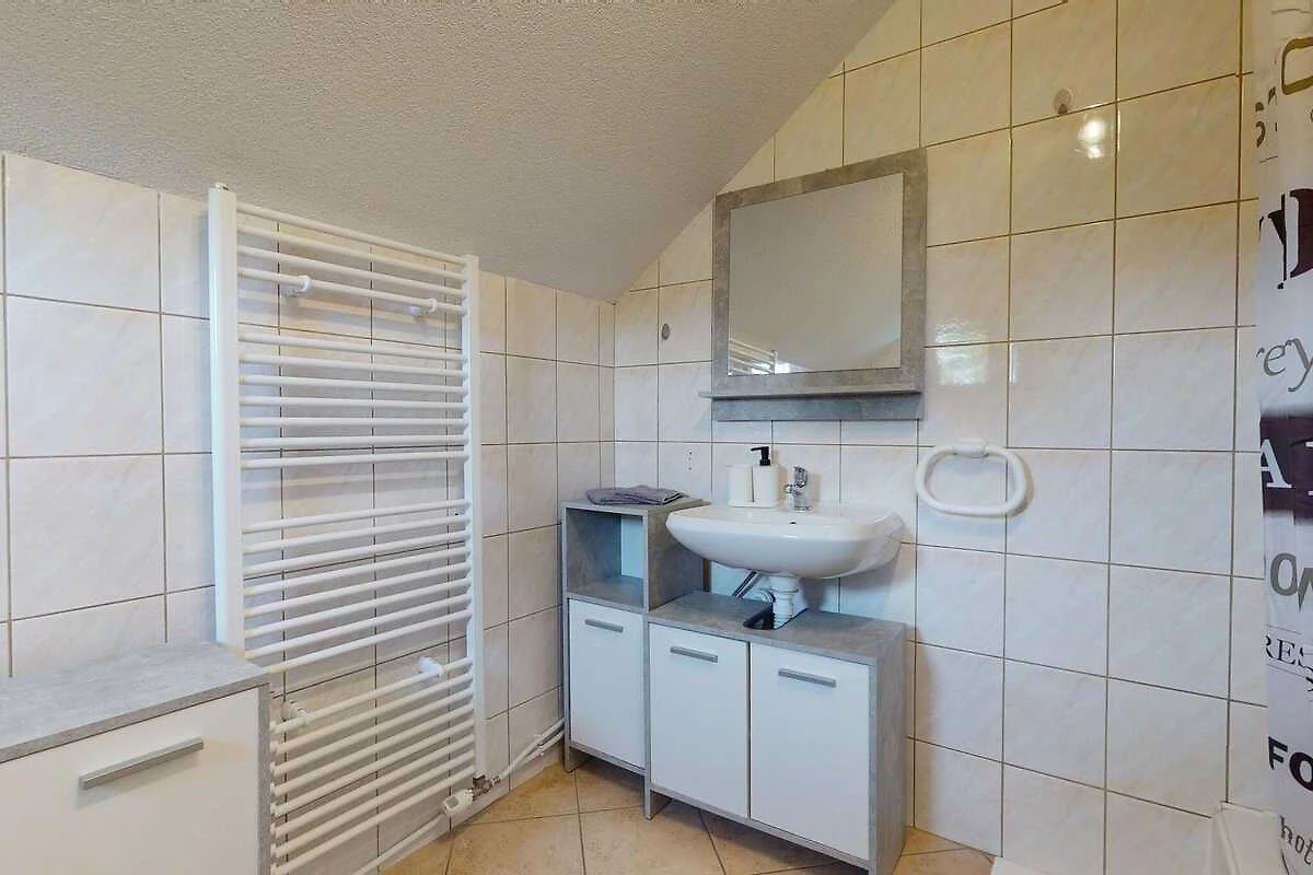 Op de 1e etage: (gang, slaapkamer(1-pers. bed, 2-pers. bed, TV), badkamer(douche, wastafel, toilet))