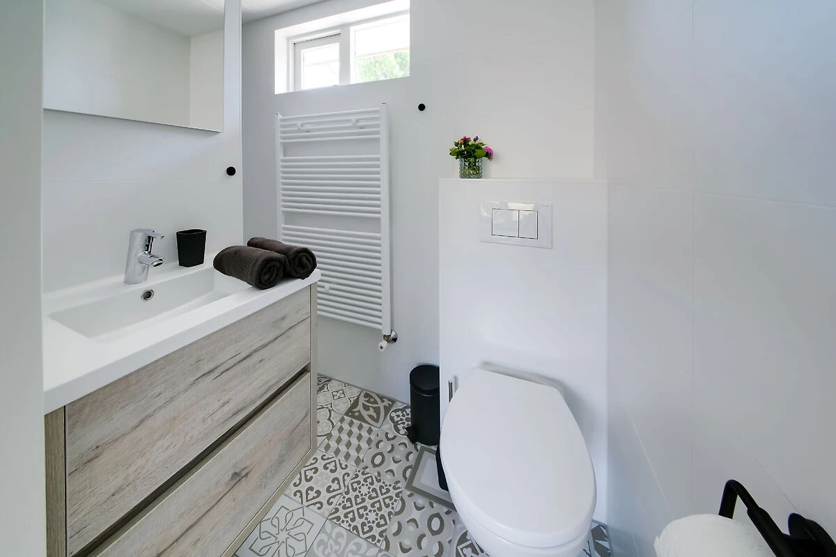 Stap binnen in een gezellige woon- en eetkamer met een satelliet-tv, een tweepersoonsslaapbank en een klein tweepersoonsbed, ideaal voor een rustgevend verblijf. De volledig uitgeruste open keuken is voorzien van een gaskookplaat, waterkoker, afzuigkap, koffiezetapparaat, combimagnetron, vaatwasser en koel-vriescombinatie, waardoor het bereiden van maaltijden moeiteloos verloopt. Een ruime slaapkamer beschikt over een luxe boxspring tweepersoonsbed en een en-suite badkamer met inloopdouche, wastafel, toilet en föhn. Buiten kunnen gasten ontspannen op het privéterras met tuinmeubilair, ligstoelen, een houtskoolbarbecue en een parasol om in de schaduw te ontspannen.
