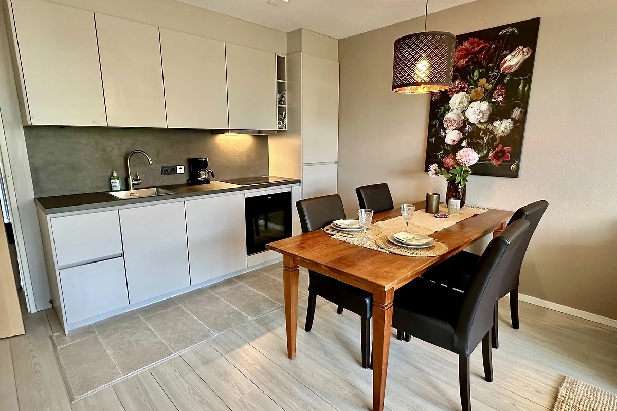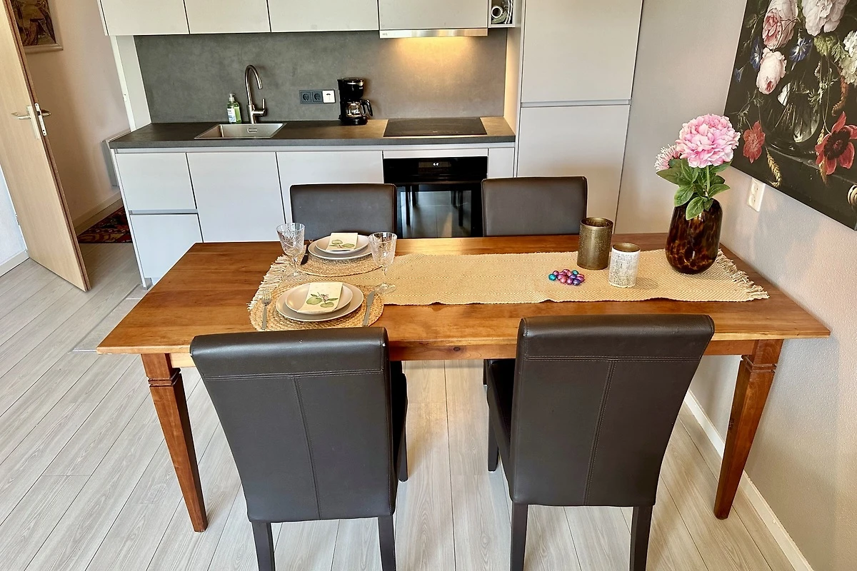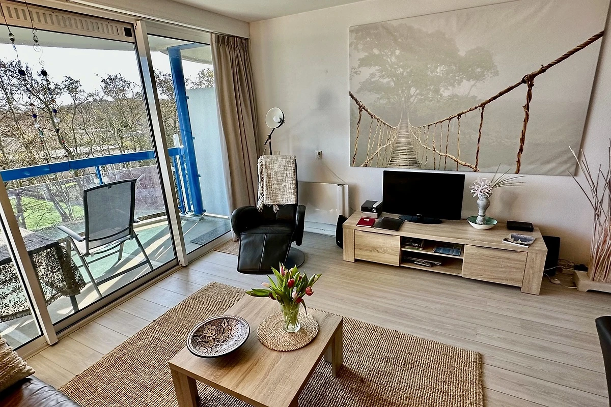 Woonkamer met (slaap)bank en comfortabele lees-/ligstoel en leeslamp - tv met meerdere Duitse zenders. Sinds 2026 is er een nieuwe en volledig uitgeruste keuken met vaatwasser, oven etc. en een gezellige eethoek. Zonnig balkon (zuid) met comfortabele, verstelbare tuinstoelen en parasol. Ruime badkamer met bad/douche en wc.
