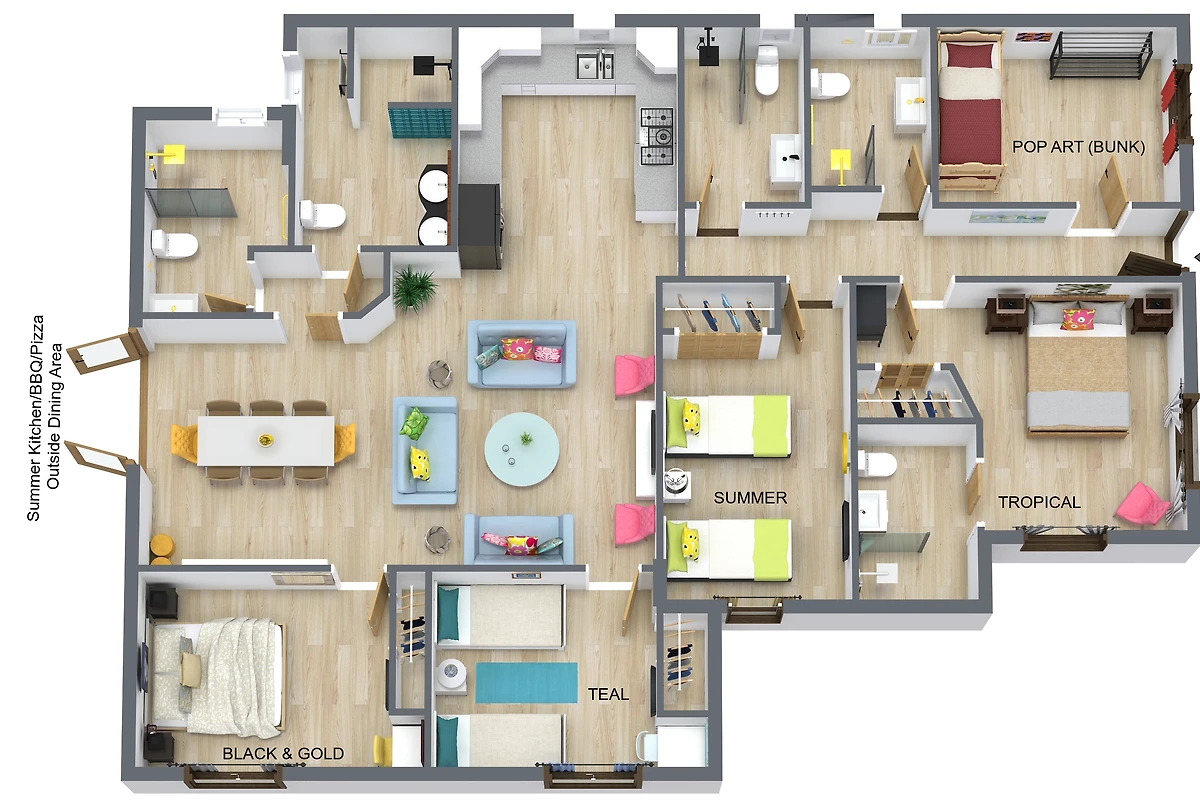 Twee van de twin slaapkamers kunnen worden omgevormd tot Super King bedden - wat veel flexibiliteit biedt, en de stapelbedkamer biedt plaats aan 3 kinderen (of volwassenen).