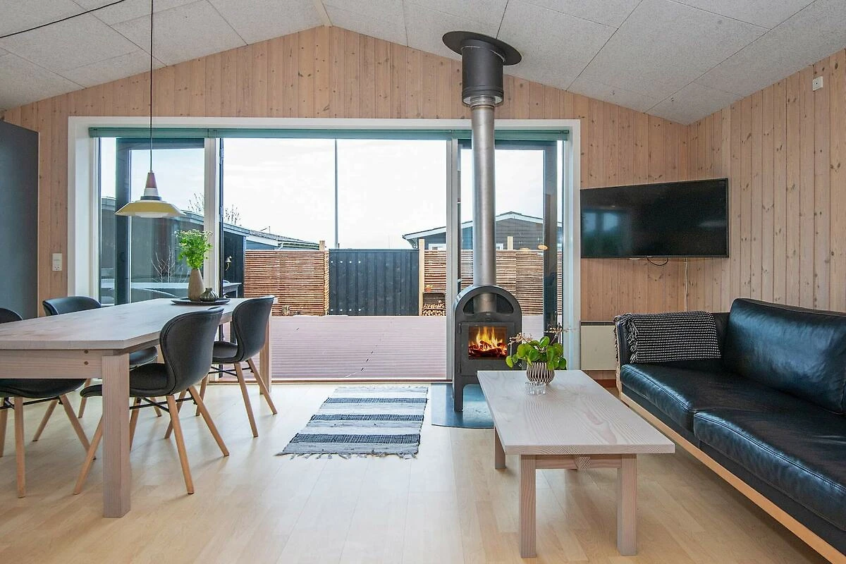 , open keuken(fornuis(elektrisch), afzuigkap, koffiezetapparaat, magnetron, afwasmachine, koelkast(+ vriesvak)), woon/slaapkamer(TV(duitse zender(s), Deense TV zenders (DR1 en TV2)), kinderstoel), slaapkamer(2-pers. bed, ledikant), slaapkamer(2x 1-pers. bed), badkamer(vloerverwarming)(wasdroger, ligbad, bad of douche, wasbak, toilet, wasmachine), bubbelbad(buiten, 4 personen), sauna(buiten), verwarming(elektrisch), terras(tuinmeubilair, ligstoelen, speeltoestellen), terras(overdekt), tuin