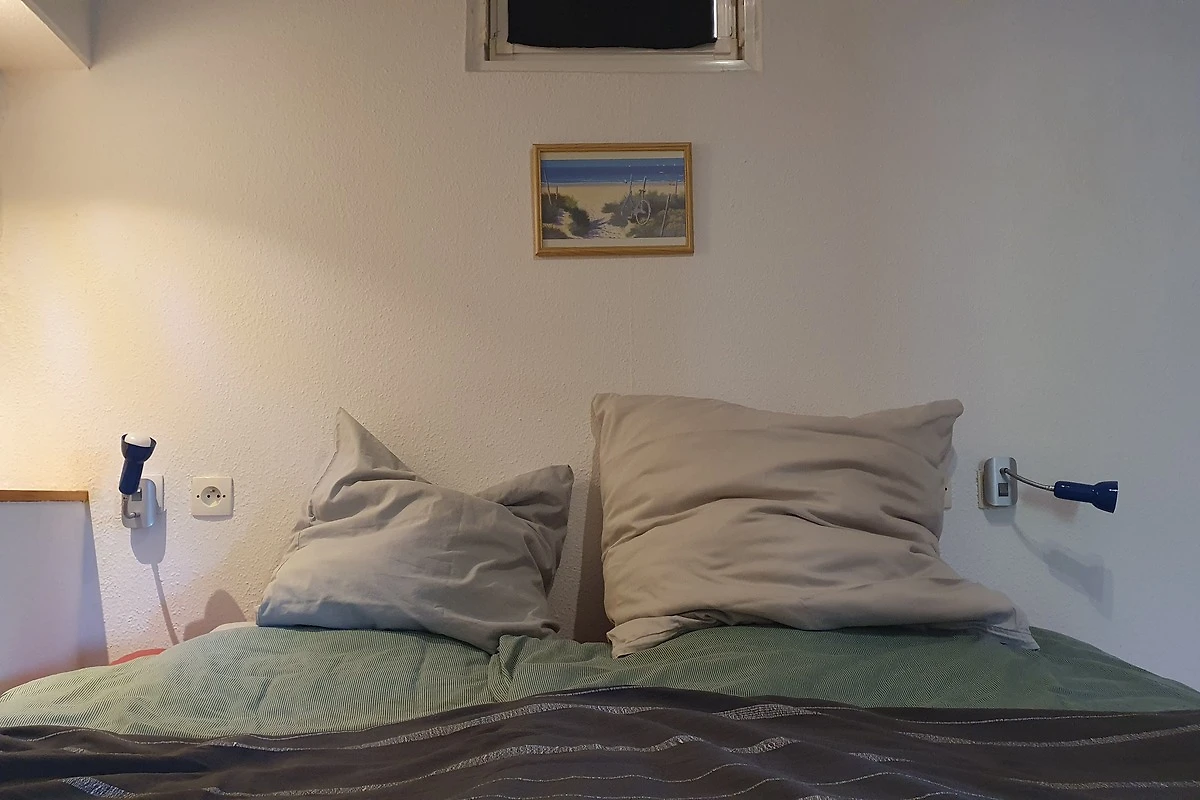 Vanuit de woonkamer rechtdoor komt u in de slaapkamer met houten parketvloer (2 treden). Hier bevindt zich een kingsize bed (1,80m x 2m) en een ingebouwde kledingkast.
