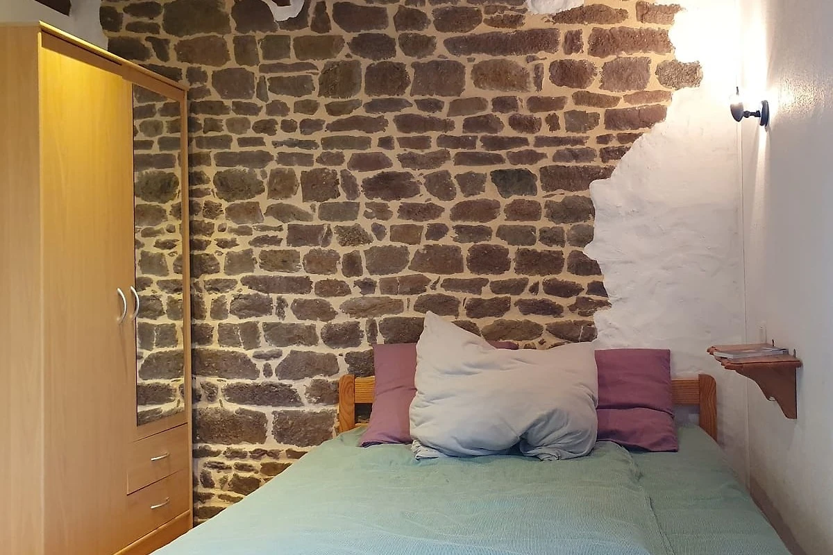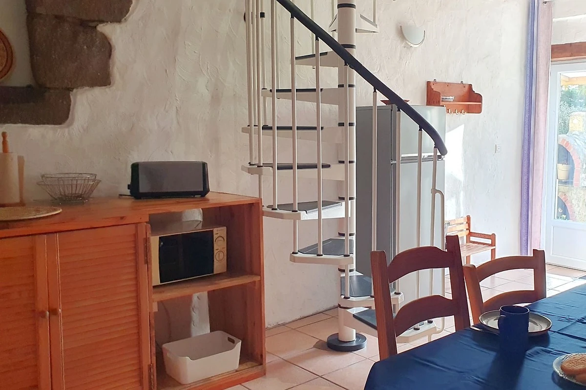 Via een wenteltrap bereikt u de eerste verdieping waar de slaapkamers met houten parketvloer zich bevinden. De kamer aan de noordkant heeft een tweepersoonsbed (1,4m x 1,90m). De kamer op het zuiden is uitgerust met een tweepersoons- en een eenpersoonsbed (1,4m x 1,90m en 0,90 x 1,90m).