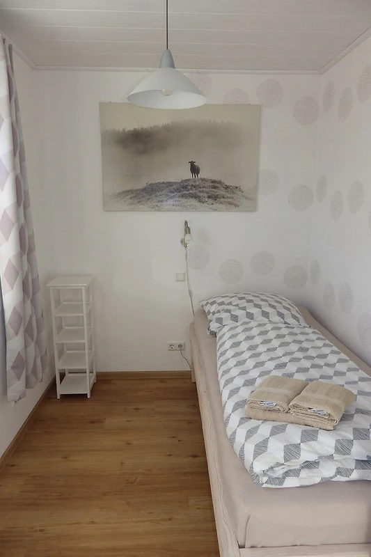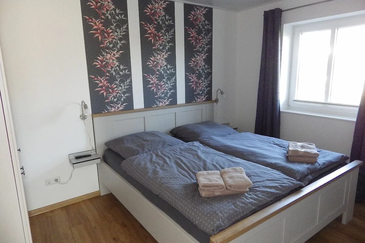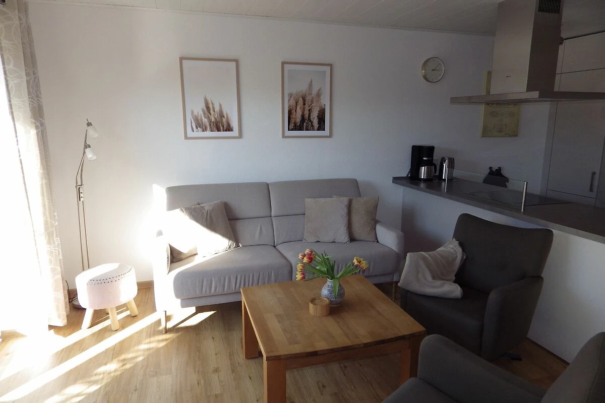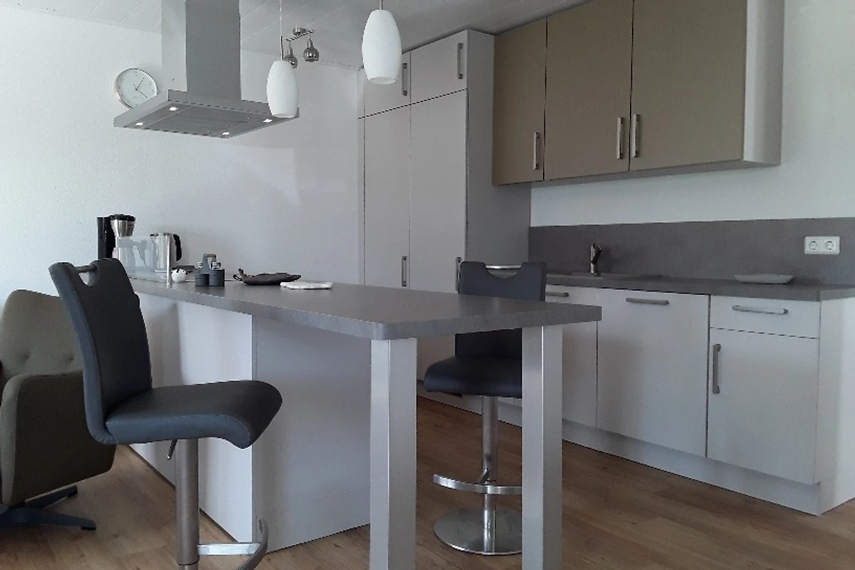 Houten huis gebouwd in 2020 in houtskeletbouw aan de Geltinger Baai. Het houten huis heeft twee appartementen met aparte ingangen op de begane grond. Een parkeerplaats is beschikbaar voor elk appartement. Het huis is voorzien van vloerverwarming en een gedecentraliseerd ventilatiesysteem. Dit draagt bij aan een comfortabel leefklimaat. De terrassen bevinden zich aan de zijkant van het gebouw met uitzicht op de tuin. Hier kunt u ontspannen, genieten van het groen en 's avonds bij zonsondergang de dag evalueren. In de tuin zijn insectvriendelijke bloemen en kruiden geplant. Het terrein is gedeeltelijk omheind. De flat vörn (ca. 60m²) heeft een woon- en eetgedeelte met open, volledig ingerichte keuken, een slaapkamer met tweepersoonsbed en TV, een slaapkamer met eenpersoonsbed en een badkamer met WC, wastafel en vloerspoeldouche met glazen wand en handdoekradiator. Het terras is uitgerust met een zitje en een parasol. Er is een fietsenrek aanwezig.