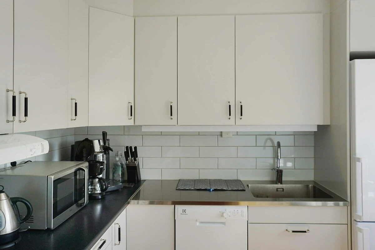 , keuken(fornuis(elektrisch), afzuigkap, koffiezetapparaat, oven, magnetron, afwasmachine, koel-/vriescombinatie), woon/slaapkamer(1-pers. bed, 1-pers. vouwbed, 2-pers. vouwbed, TV, DVD-speler, radio, CD-speler, chromecast), badkamer(ligbad, wasbak, toilet), verwarming(CV), parking