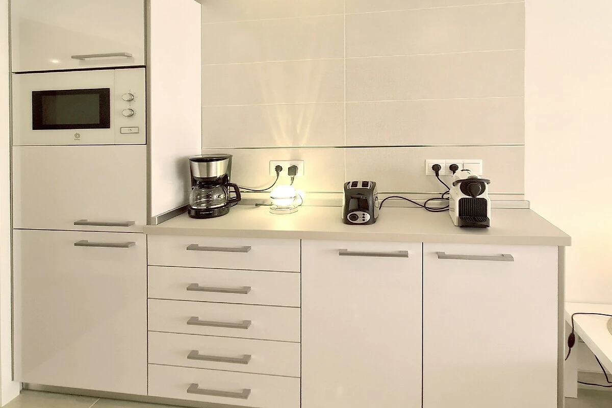 Het niveau op de 1e verdieping biedt een groot zonnig terras op het zuiden met uitzicht op zee, ramen van vloer tot plafond, 2 slaapkamers met elk een kledingkast, 2 tv's met alle Duitse zenders, Netflix, gratis internet met flat/WLAN in de flat, 2 airconditioners, kluis en een hoogwaardige moderne en volledig uitgeruste keuken. Op het onderste terras vindt u een elektrische barbecue.