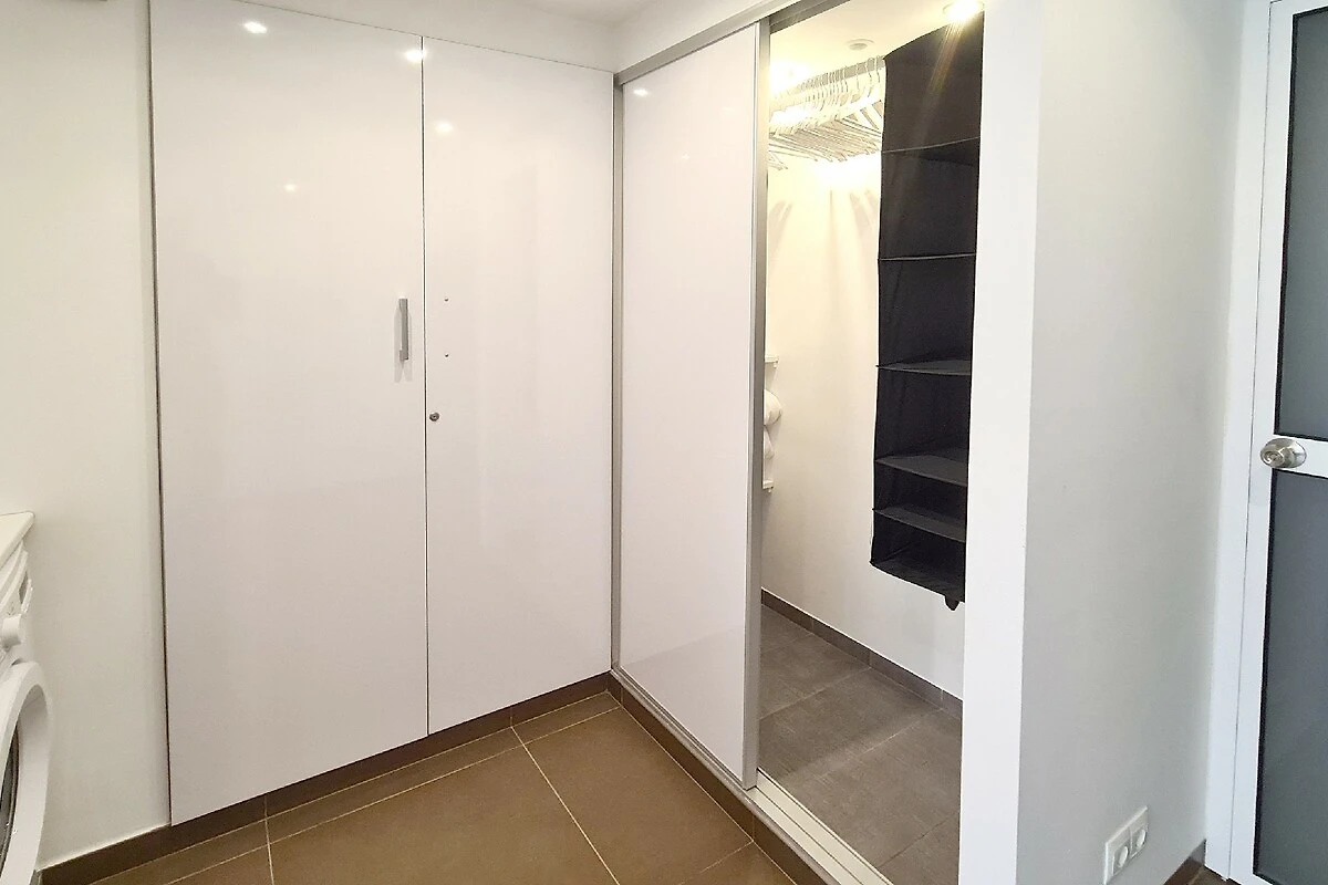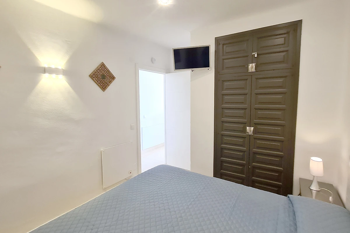 Ook hier, net als boven, airconditioning, tweepersoonsbed en eigen badkamer. Met volledig ingerichte keuken beneden (vaatwasser, oven, keramische kookplaat, magnetron etc.). De koelkast staat in de aangrenzende bijkeuken met deur - voor de rust 's nachts. Hier staat ook de grote kledingkast.