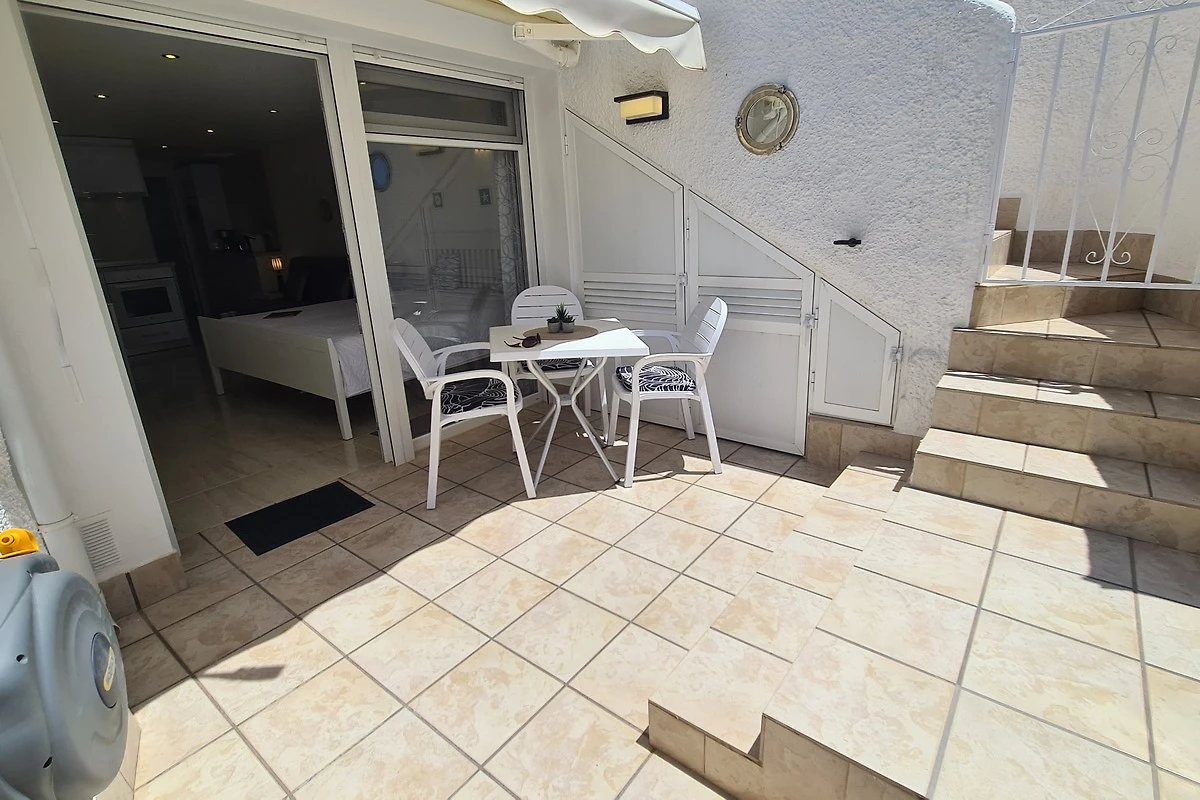 Onder het terras van 16 m² op het zuiden bevindt zich het verdere terras voor de studio (een patio) van 15 m² - met tuindouche (warm water) en tuinslang, wat vooral na een bezoek aan het strand een groot voordeel is. Hier is de korte trap die beneden en boven met elkaar verbindt. Boven is er nog een achteringang op de begane grond. Het huis is immers gebouwd op terrassen, met een trapvrije loopbrug rond de buitenkant tussen de twee niveaus. Deze woning is dus ook geschikt voor flexibele rolstoelgebruikers die niet staan op volledige naleving van de normen.