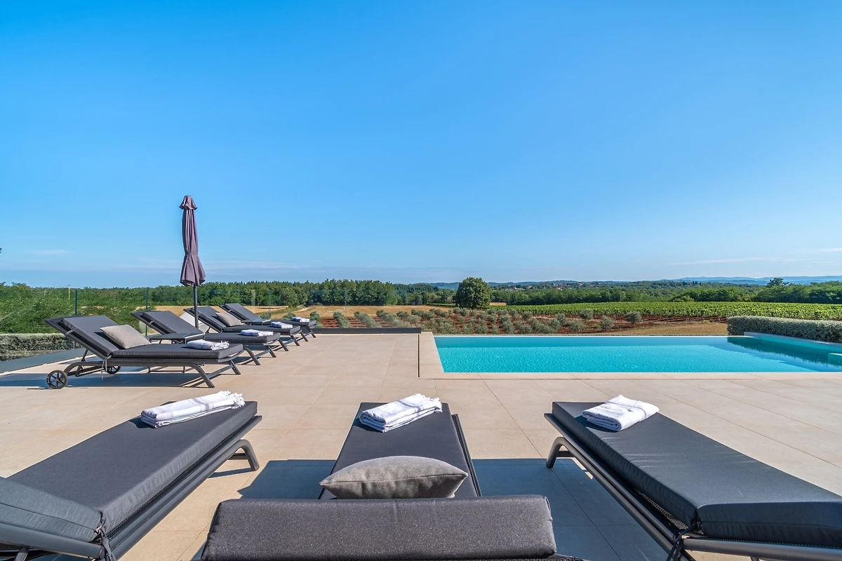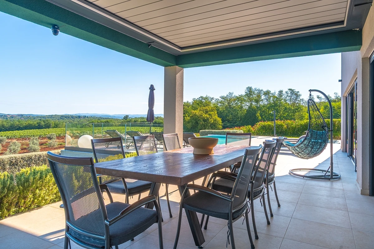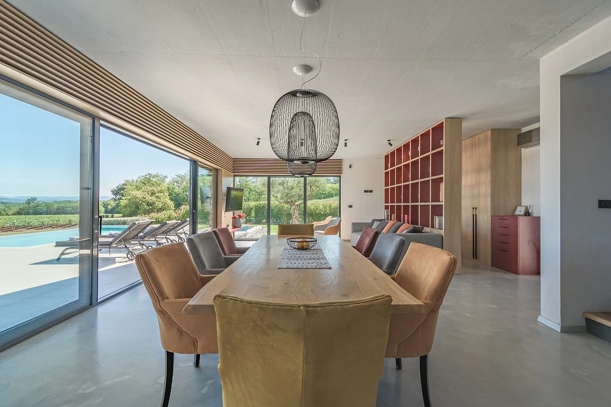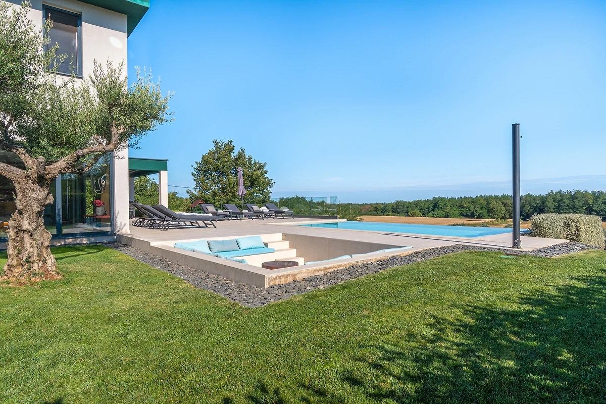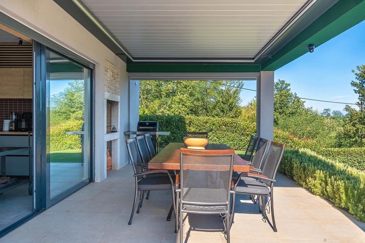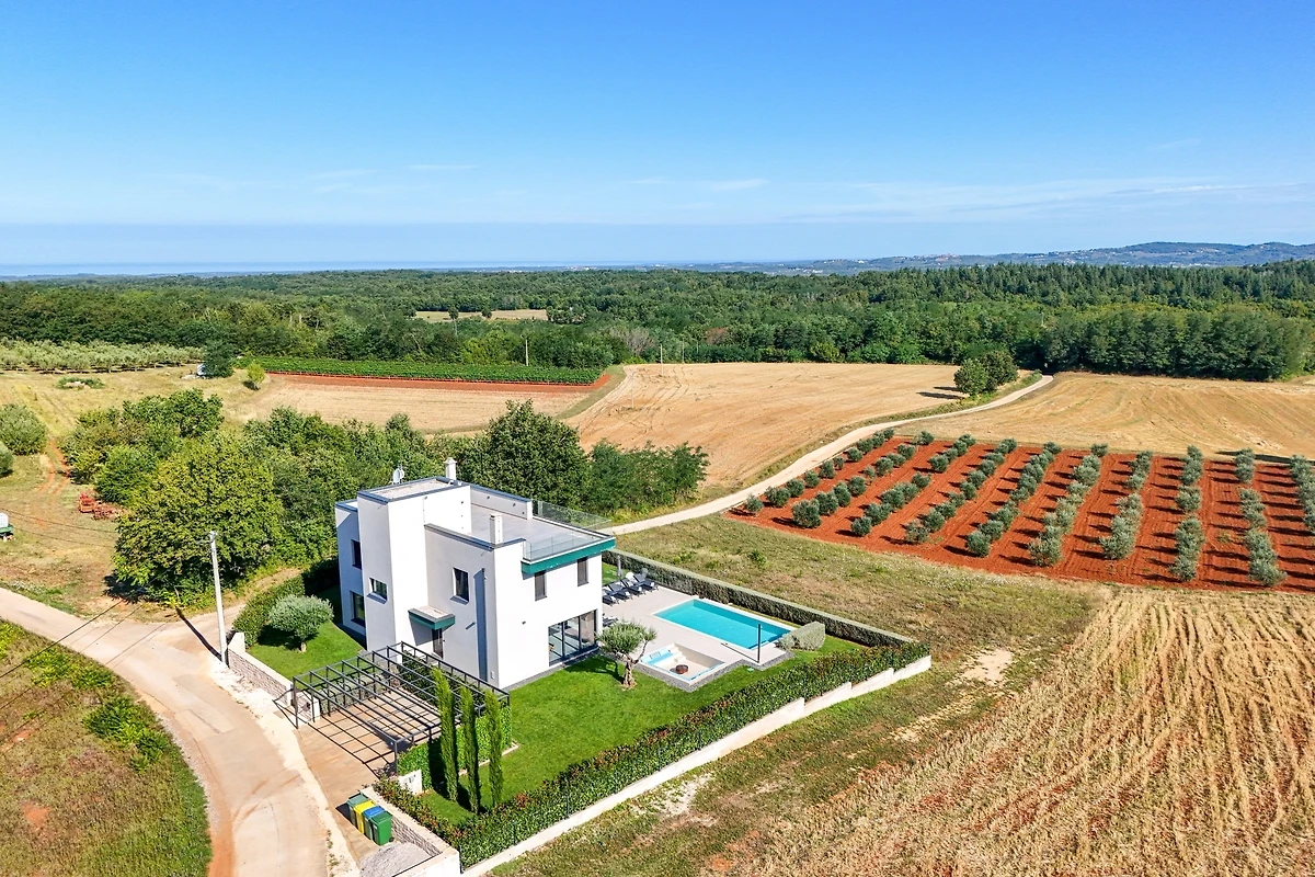 Het huis ligt afgelegen en biedt veel privacy. Uitzicht op de natuur vanuit bijna alle kamers. Bovenaan het huis is er een terras met zicht op zee, de Alpen en Porec in de verte
