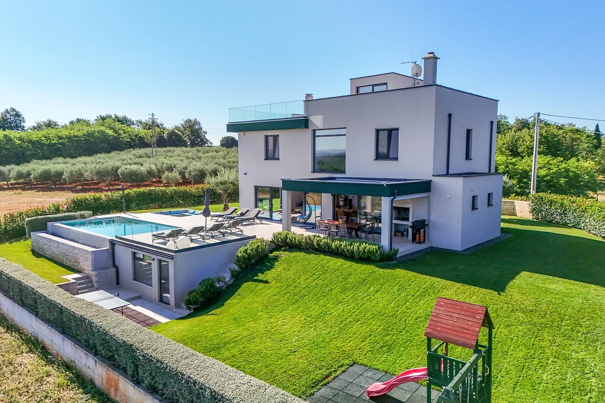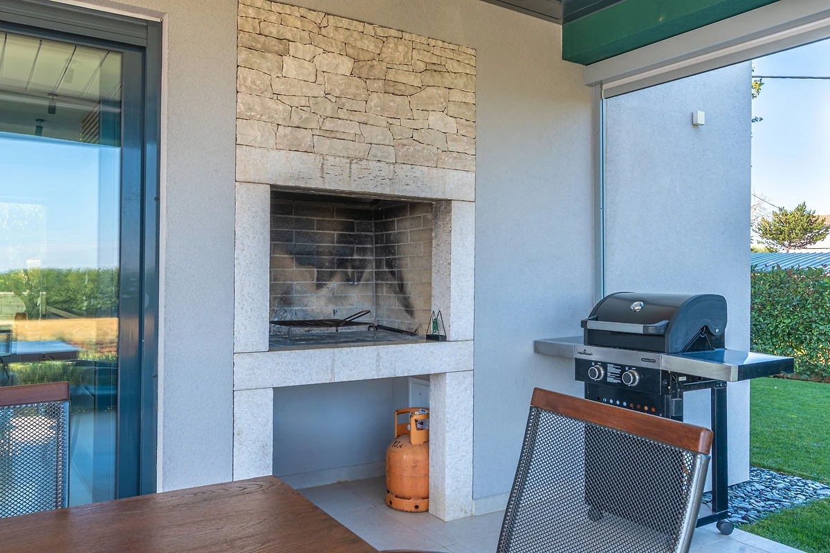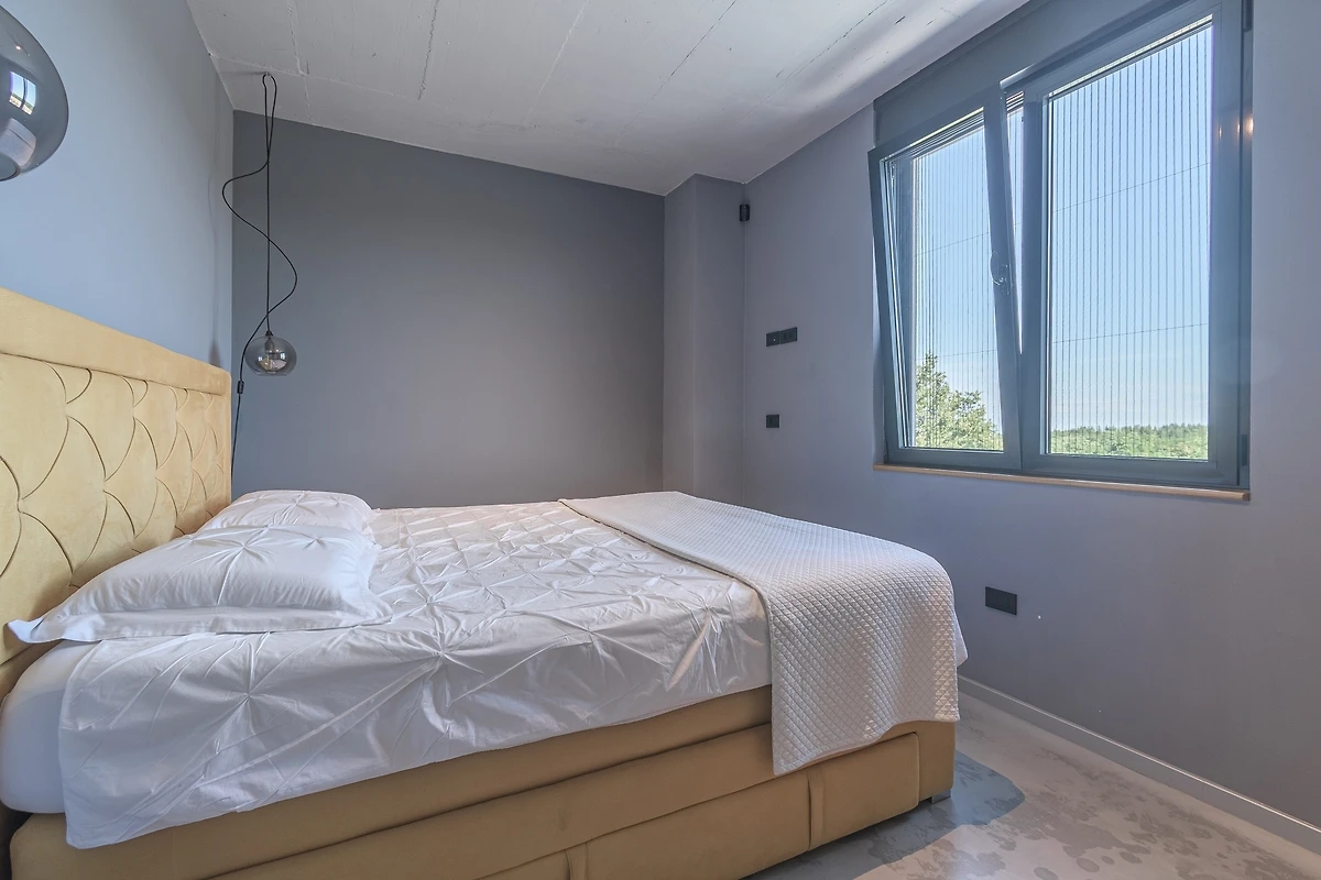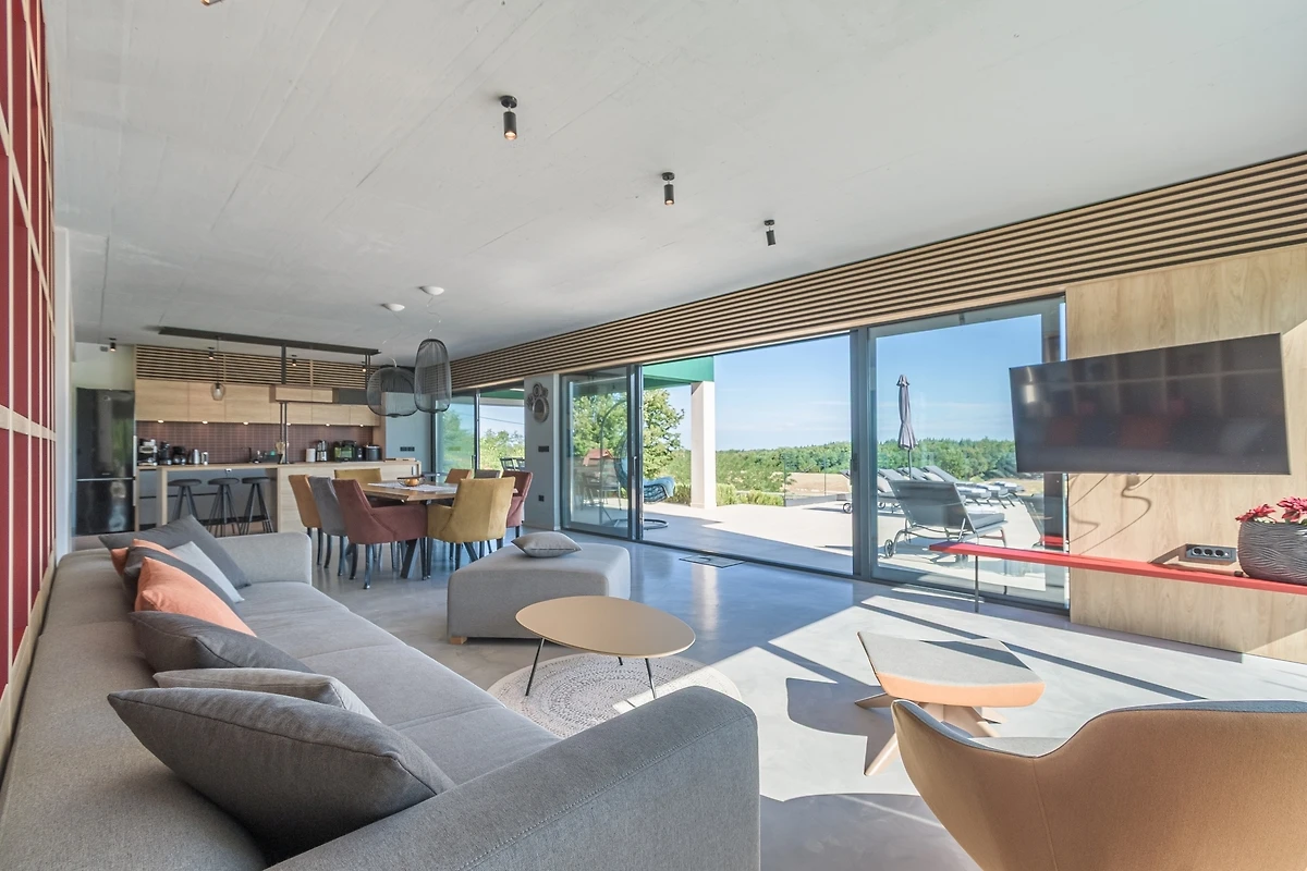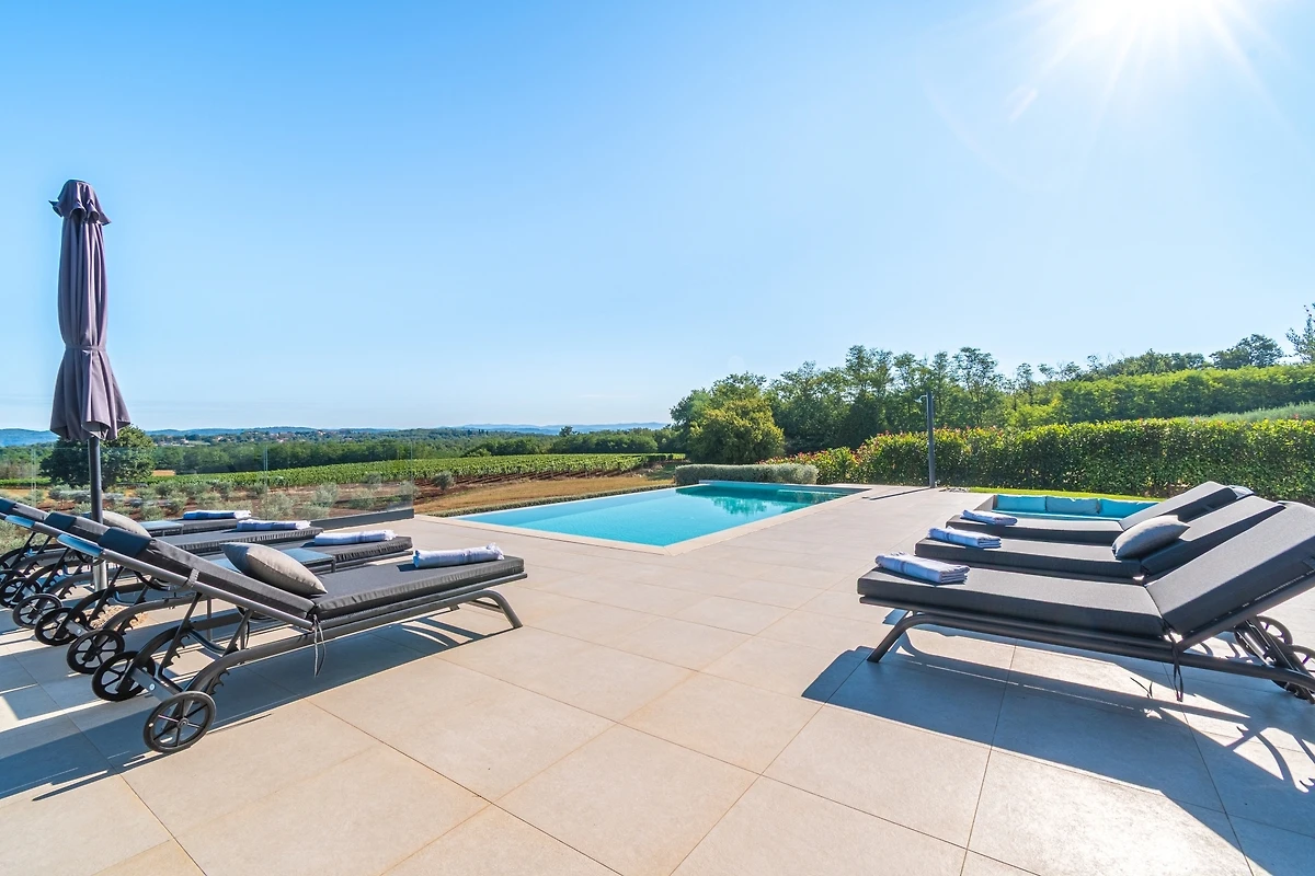 Het huis ligt afgelegen en biedt veel privacy. Uitzicht op de natuur vanuit bijna alle kamers. Bovenaan het huis is er een terras met zicht op zee, de Alpen en Porec in de verte