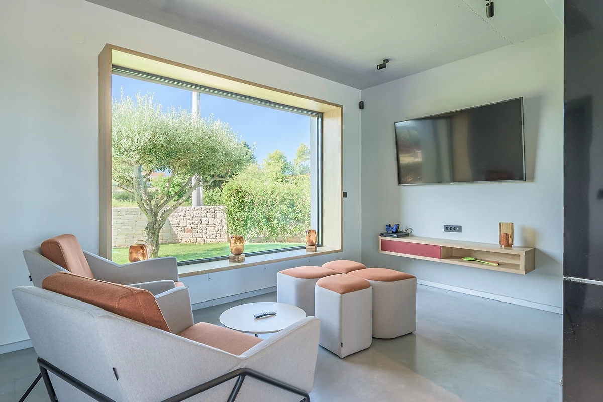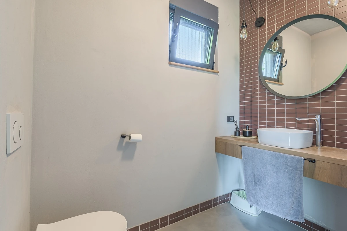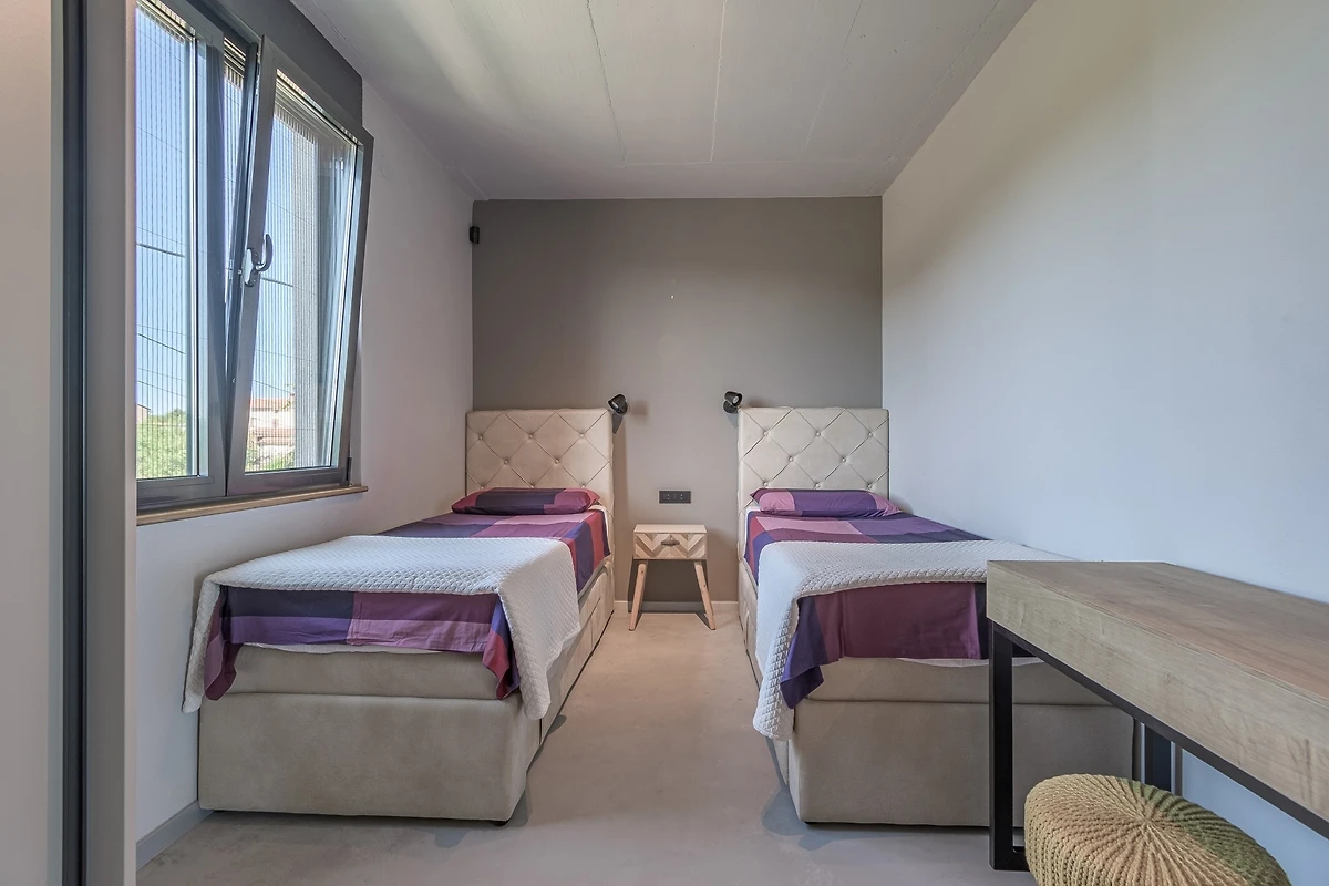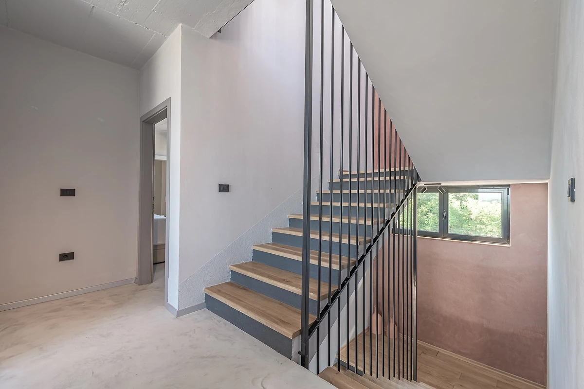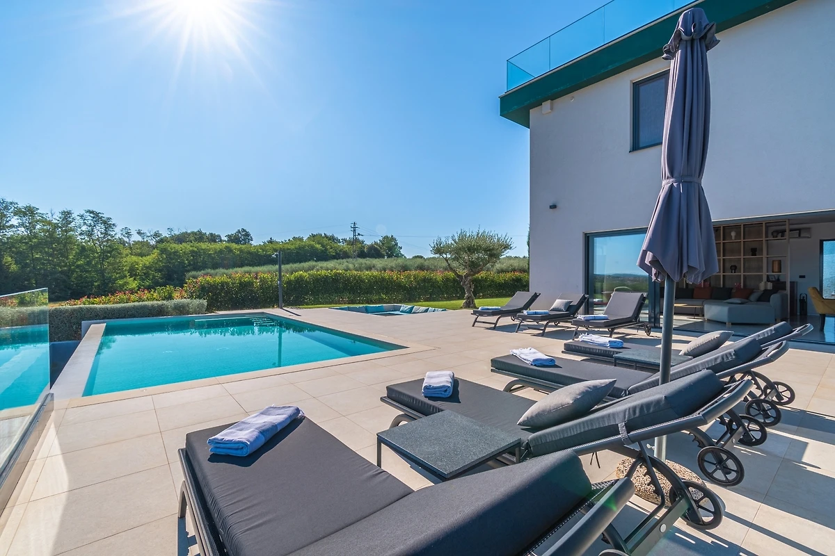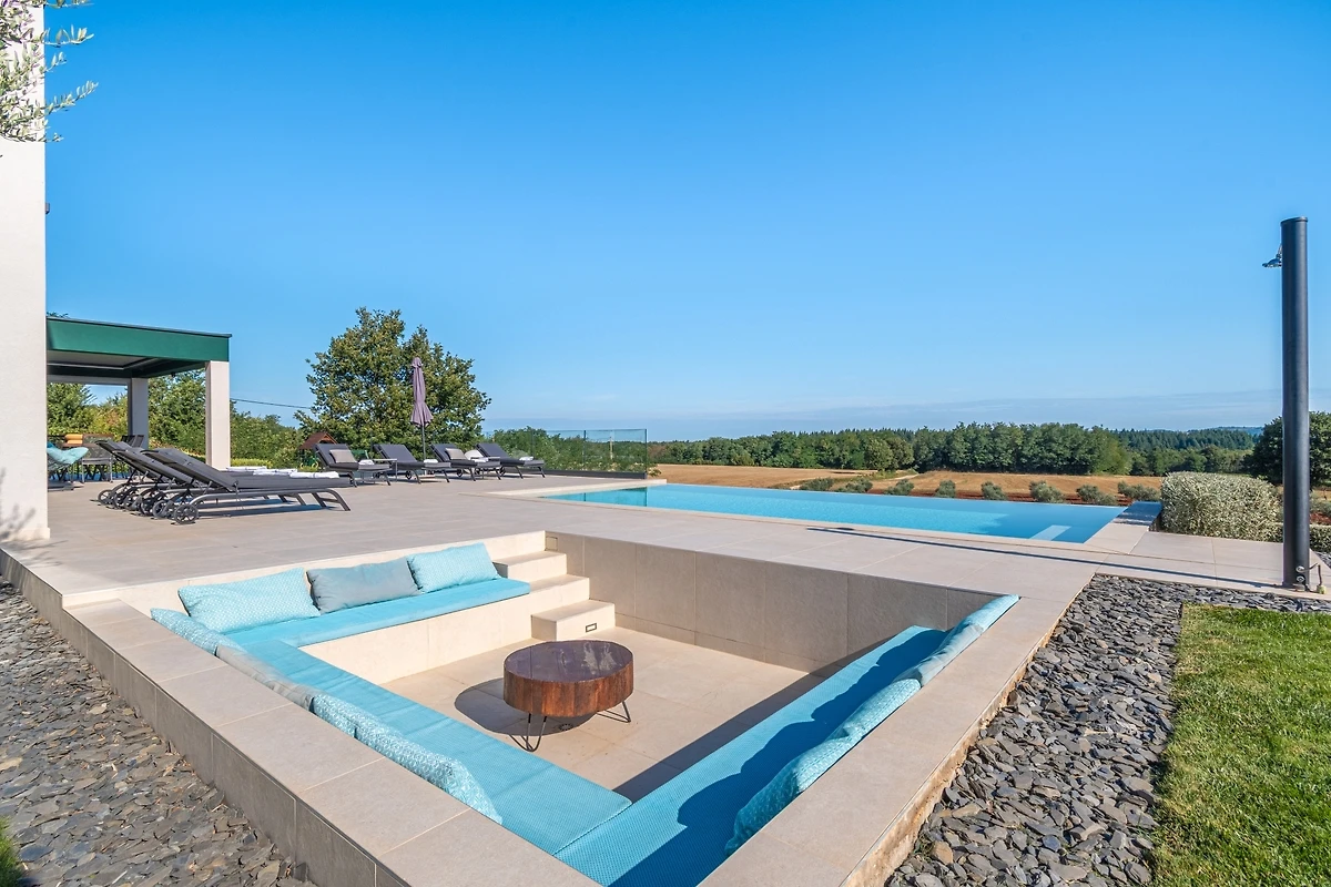 Het huis ligt afgelegen en biedt veel privacy. Uitzicht op de natuur vanuit bijna alle kamers. Bovenaan het huis is er een terras met zicht op zee, de Alpen en Porec in de verte