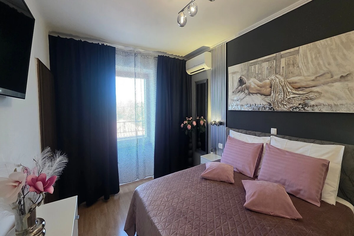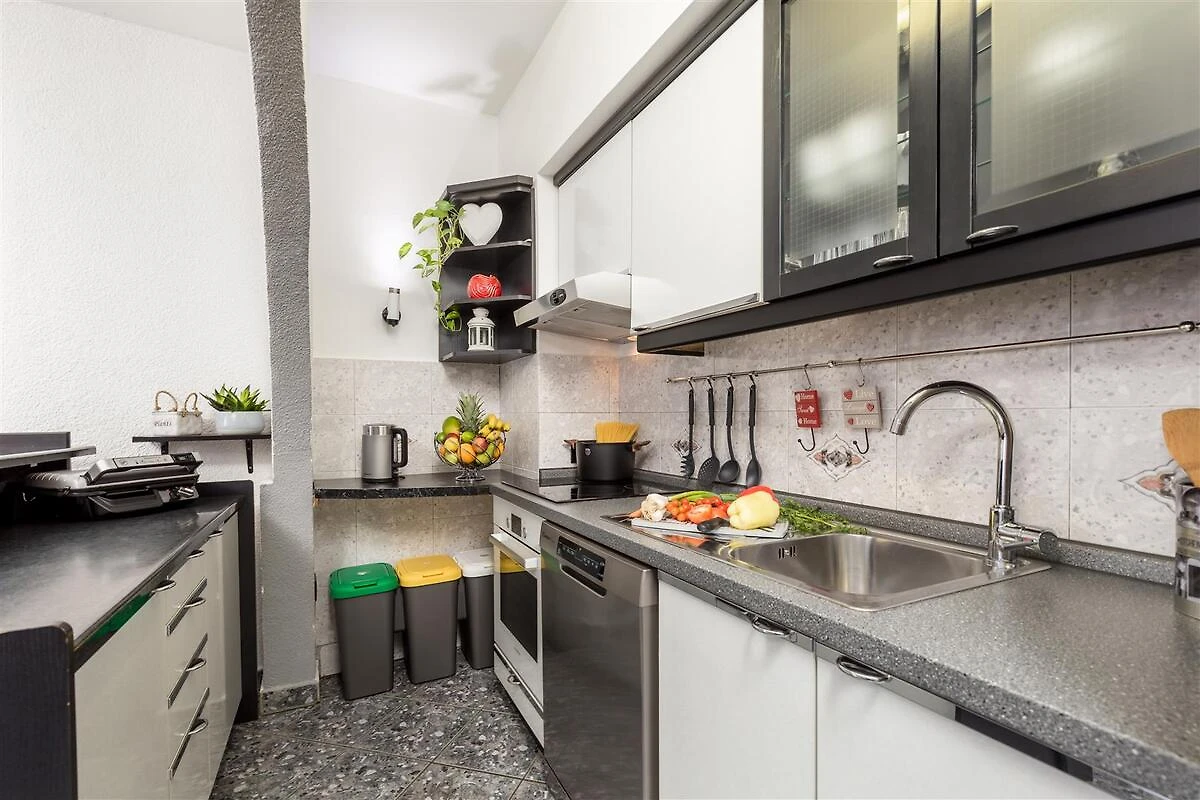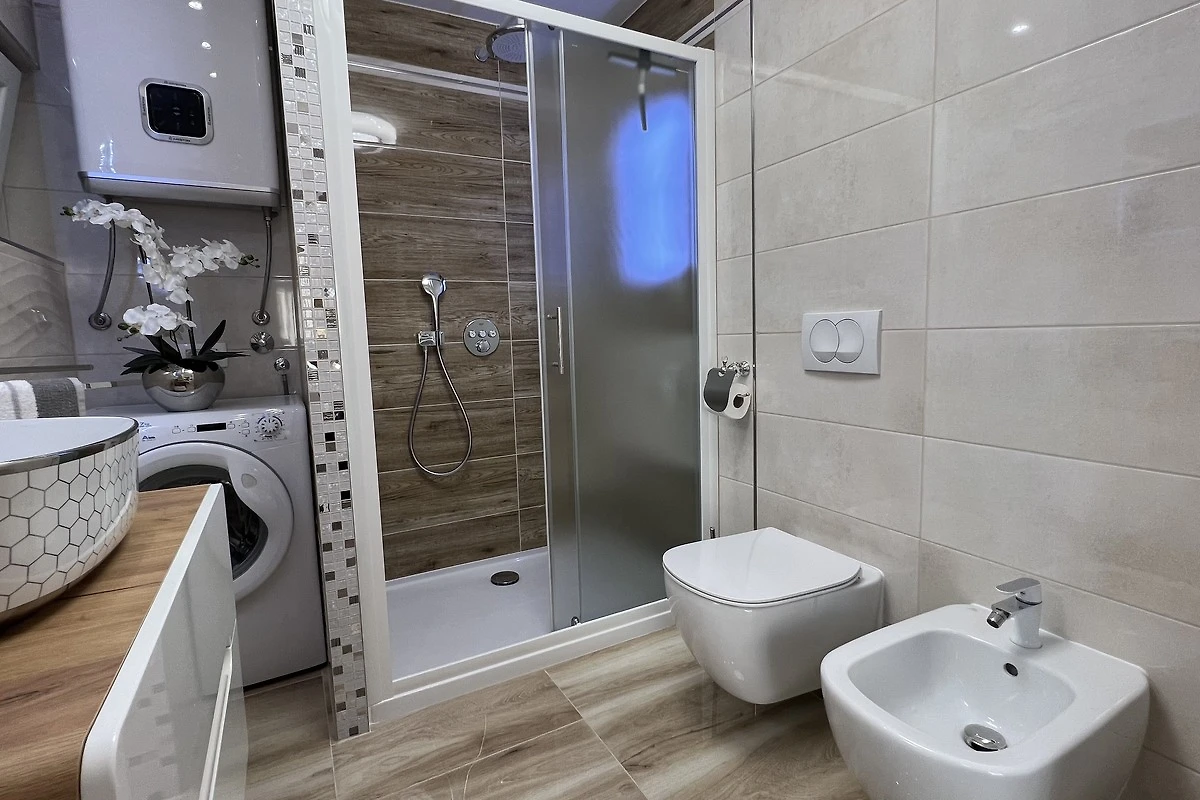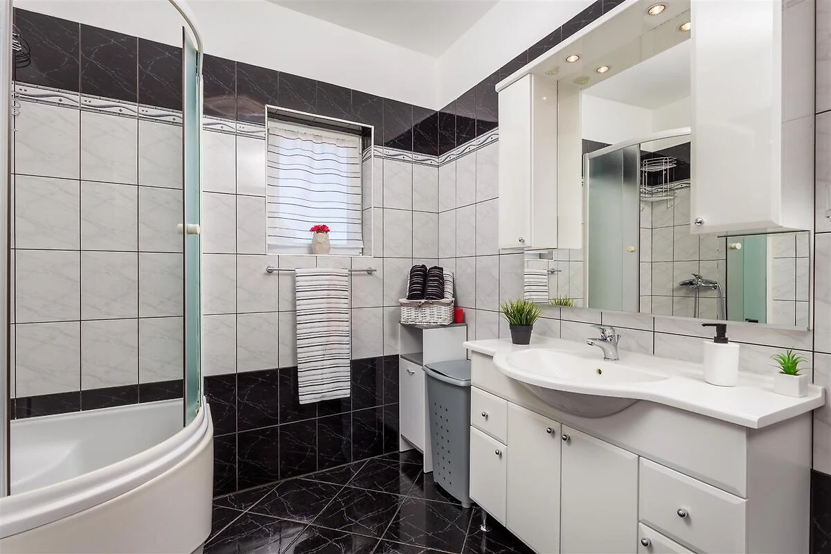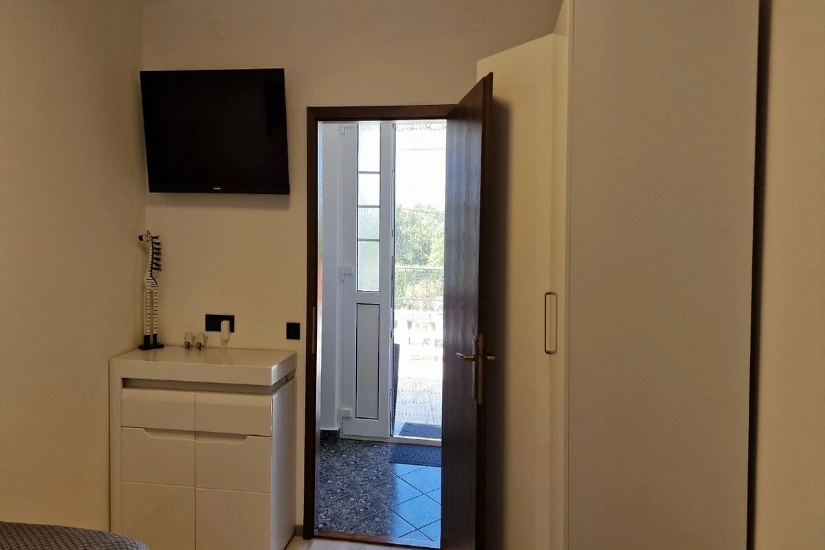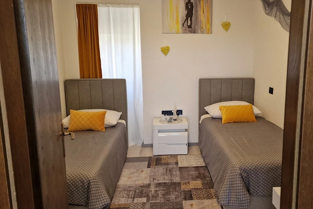 Het appartement op de begane grond heeft twee mooi ingerichte slaapkamers met comfortabele tweepersoonsbedden, grote kledingkasten, elk met een eigen airconditioning en een televisie. De ruime keuken is volledig uitgerust en biedt alles wat u nodig heeft om heerlijke maaltijden te bereiden: een gasfornuis, een magnetron, een grote koelkast met vriesvak, een broodrooster, een waterkoker, een koffiezetapparaat en een vaatwasser. Naast de keuken bevindt zich een eetgedeelte met een grote tafel voor zes personen, ideaal voor gezamenlijke maaltijden. De woonkamer beschikt over een gezellige sofa en een grote televisie met satellietkanalen, wat aangename avonden met films en series mogelijk maakt. De badkamer is modern ingericht met een douche, een wastafel, een toilet en een wasmachine. Vanuit het appartement op de begane grond heeft u directe toegang tot het terras en de tuin, waar u zich kunt ontspannen in een mooie natuurlijke omgeving. Het appartement op de eerste verdieping is ook goed uitgerust en biedt dezelfde functionaliteit als de begane grond. Ook hier is er een keuken met alle noodzakelijke apparaten voor het zelfstandig bereiden van maaltijden. De eettafel is hier voor vier personen uitgelegd. Ook dit appartement heeft twee slaapkamers - een met een tweepersoonsbed en de andere met twee eenpersoonsbedden. Beide slaapkamers zijn uitgerust met een televisie en airconditioning, wat op hete zomerdagen voor optimaal comfort zorgt. De badkamer is uitgerust met een douche, een wastafel, een toilet en een wasmachine. De gasten op de eerste verdieping hebben bovendien toegang tot een zonnig terras met een mooi uitzicht op het zwembad en de omliggende natuur.
