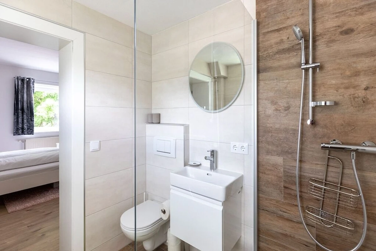 Op de 1e etage: (woonkamer(1-pers. slaapbank(145 x 190 cm), TV, radio), keuken(waterkoker, broodrooster, afzuigkap, oven, magnetron, afwasmachine, koelkast), slaapkamer(2-pers. bed(180 x 200 cm)), badkamer(douche, wastafel, toilet, haardroger))