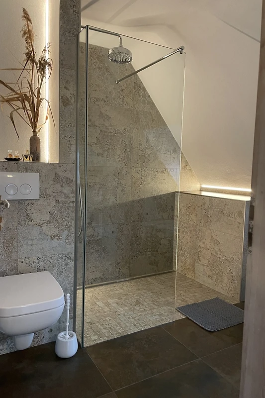 Boven zijn de 3 slaapkamers, 2 kamers met elk een tweepersoonsbed, 1 met een eenpersoonsbed dat kan worden omgezet in een tweepersoonsbed van 160x200. De badkamer op de bovenverdieping heeft een gelijkvloerse douche, wastafel, toilet en elektrische vloerverwarming.
