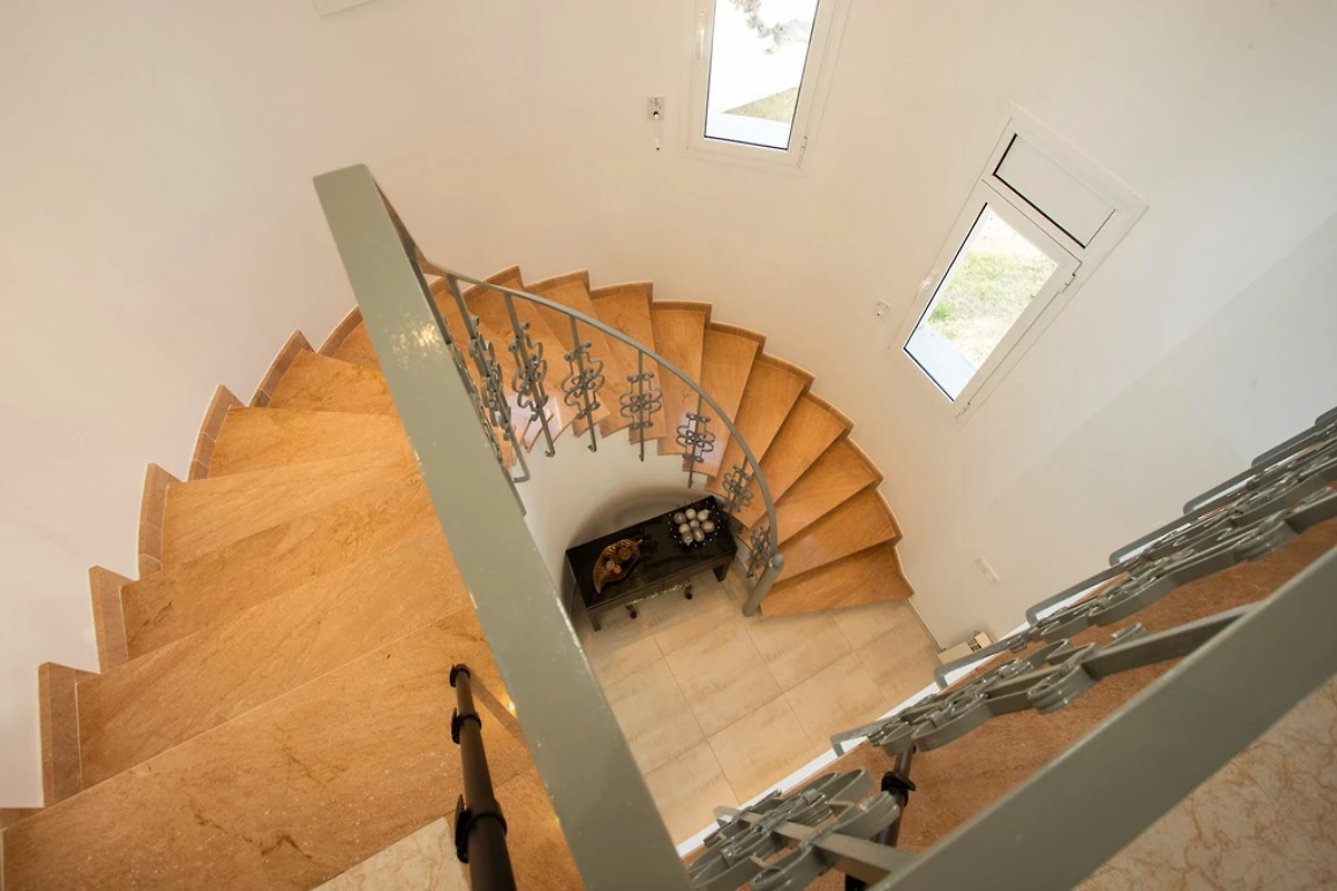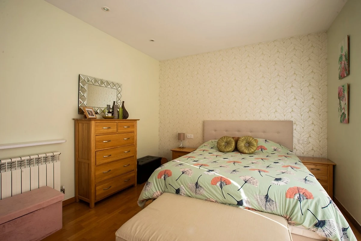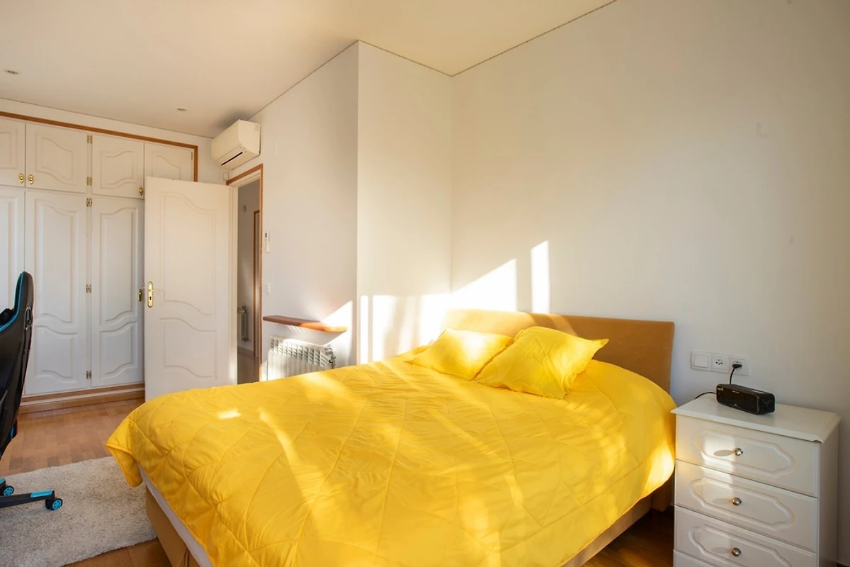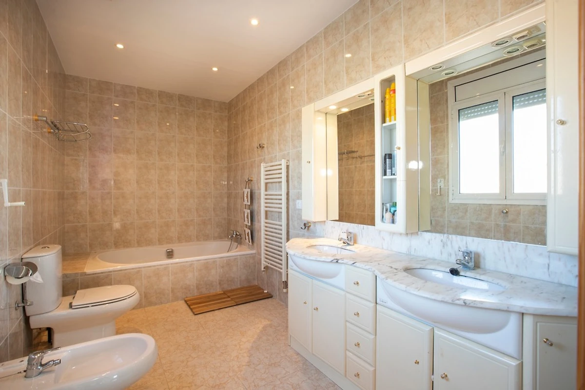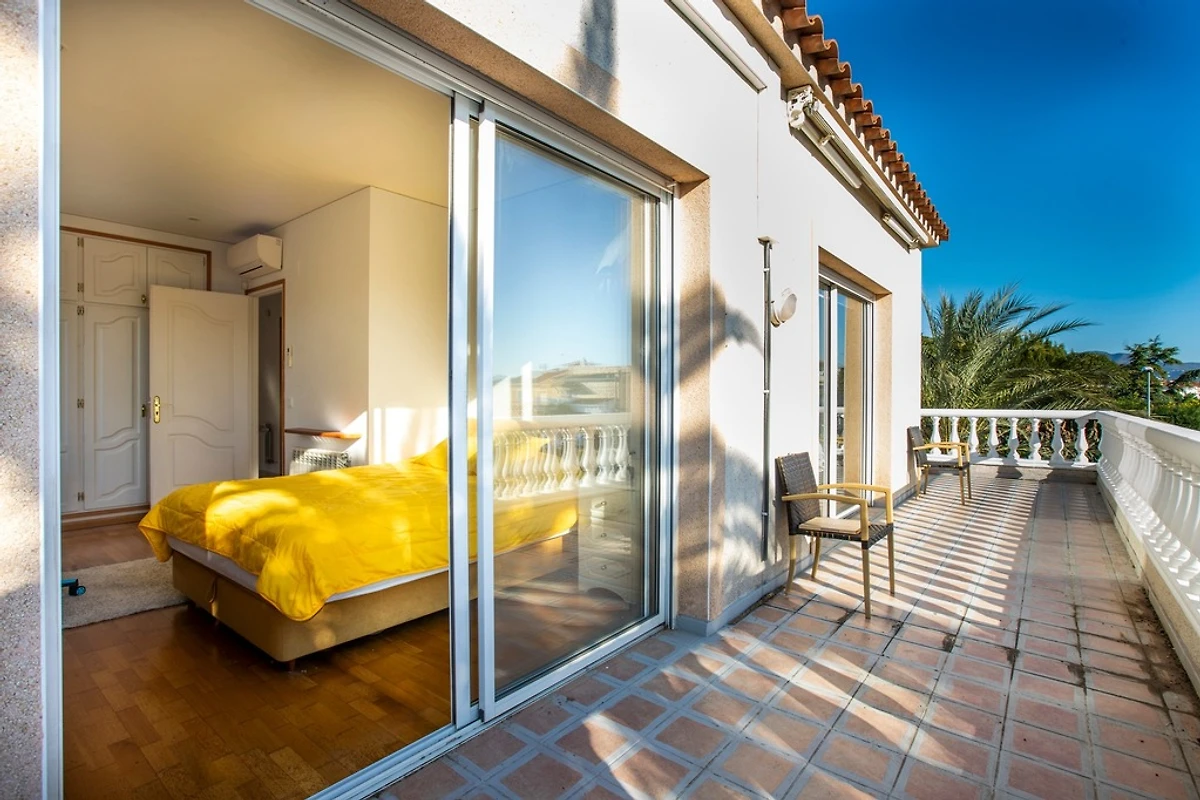Als we de trap opgaan, vinden we de 3 slaapkamers met tweepersoonsbedden, waarvan er 2 toegang hebben tot een groot terras. De 3 slaapkamers zijn voorzien van airconditioning, 1 van de slaapkamers heeft een TV. We hebben ook een badkamer met bad en toilet.