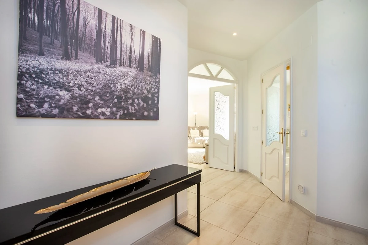 Bij binnenkomst vinden we een woonkamer met 2 banken en TV, vlak daarna is de volledig uitgeruste en moderne Amerikaanse keuken met geïntegreerde tafel en 6 krukken om te dineren.