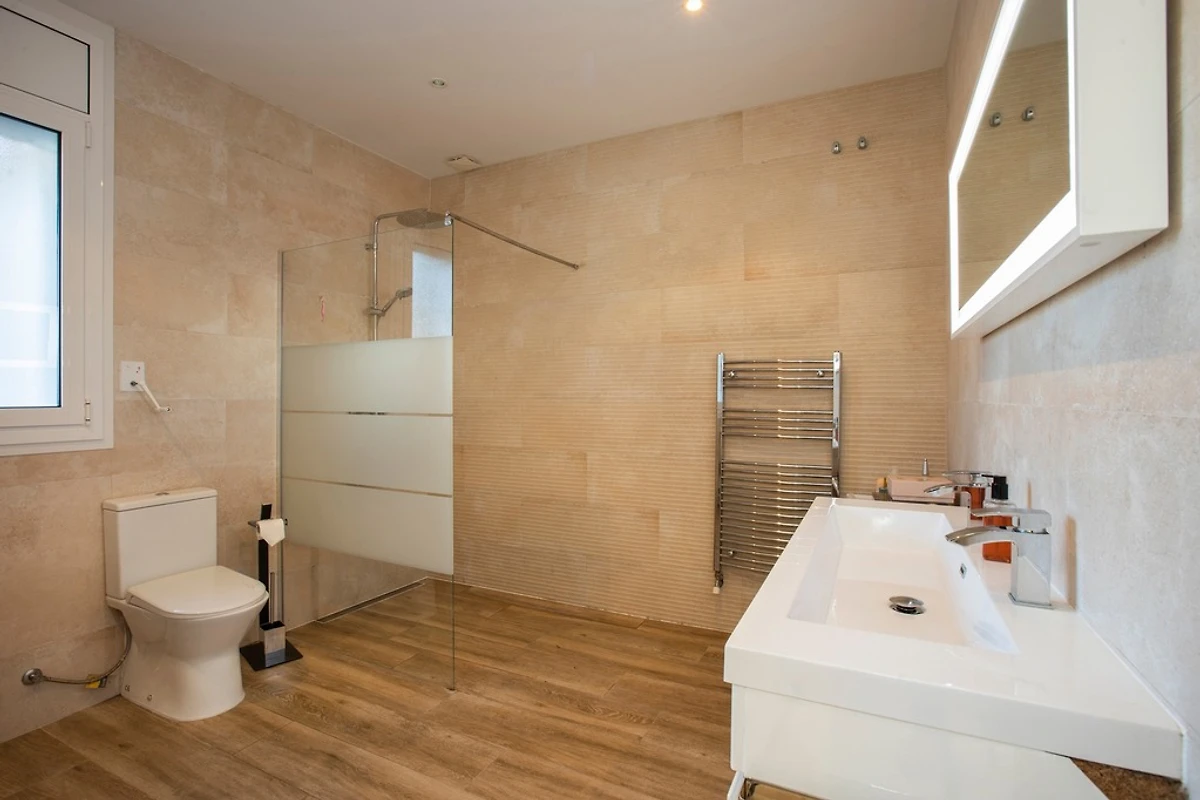Op de begane grond is er een badkamer met ruime douche, toilet, wasmachine en droger.