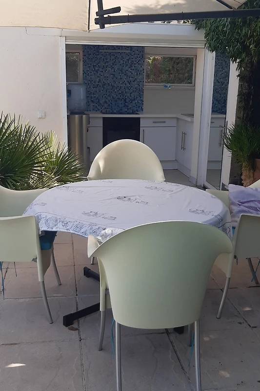 Buiten terrassen met BBQ naast en achter het appartement .
