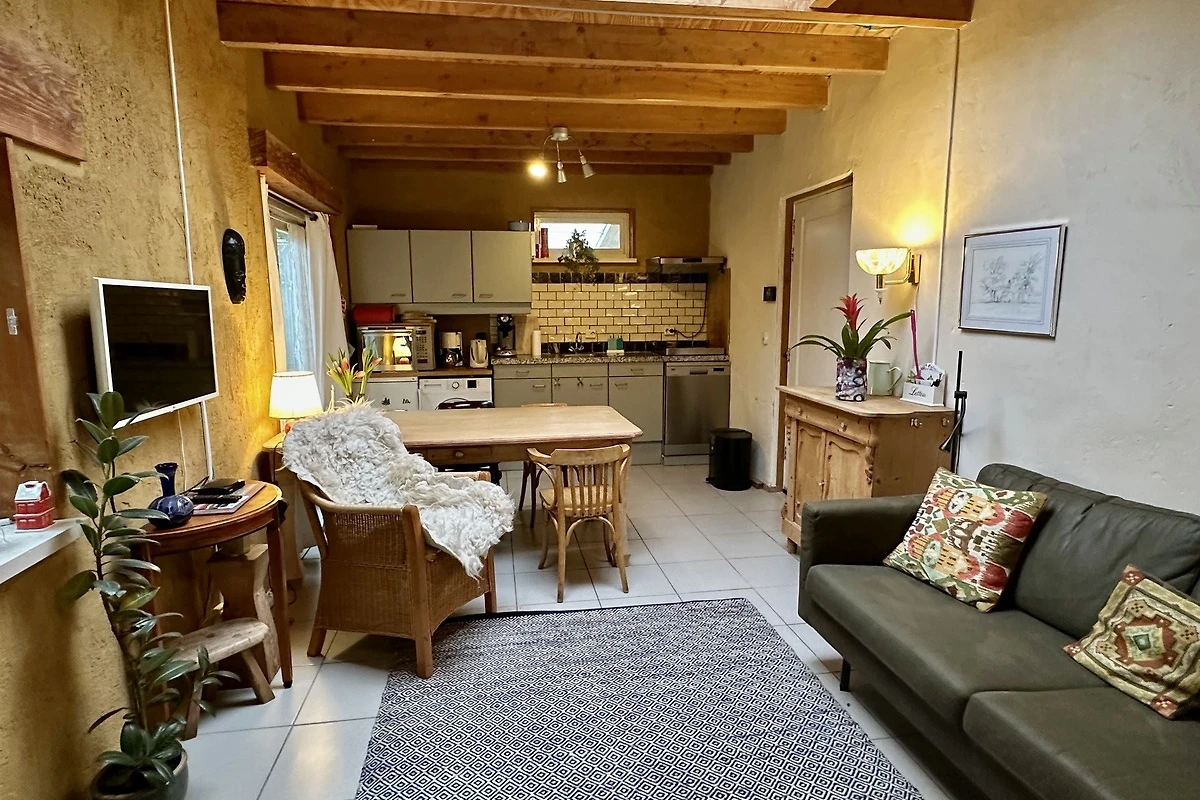Begane grond: Woongedeelte met comfortabele bank, TV met Duitse programma's, eettafel, open en goed uitgeruste keuken (filterkoffiezetapparaat en Senseo). Van daaruit kom je op het kleine terras met picknicktafel. Aparte WC.