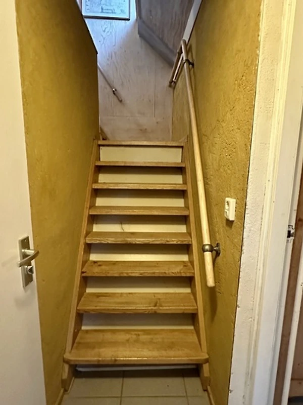 Via een ietwat steile trap met leuning komt u op de 1e verdieping. Er is 1 slaapkamer met tweepersoonsbed en ladekast, 1 slaapkamer met 2 eenpersoonsbedden en een eenvoudige badkamer met douche, wastafel en toilet