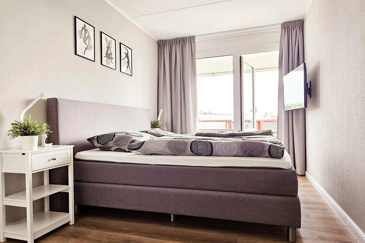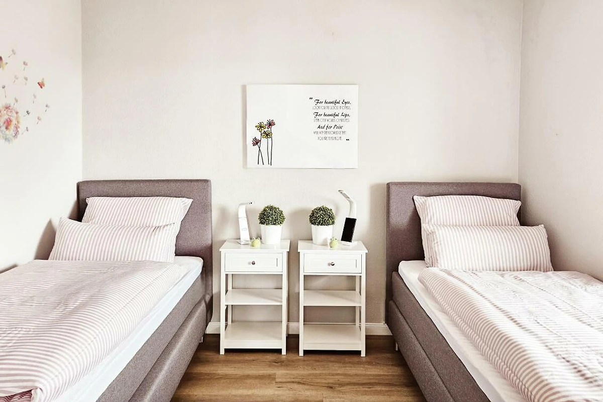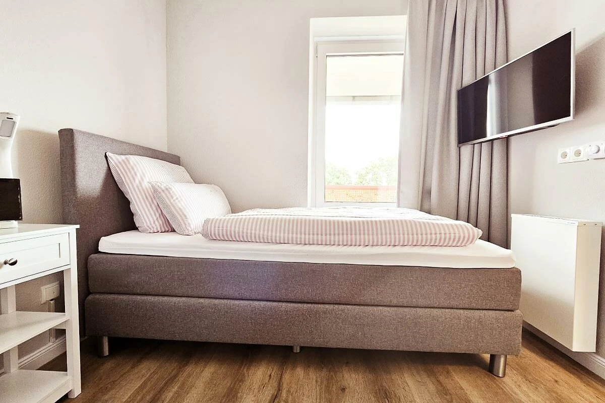 Vanuit de hal is er toegang tot de twee slaapkamers. De eerste slaapkamer heeft een royaal tweepersoons bed, tv en een openslaande deur naar het balkon. De tweede slaapkamer heeft twee losse eenpersoonsbedden.