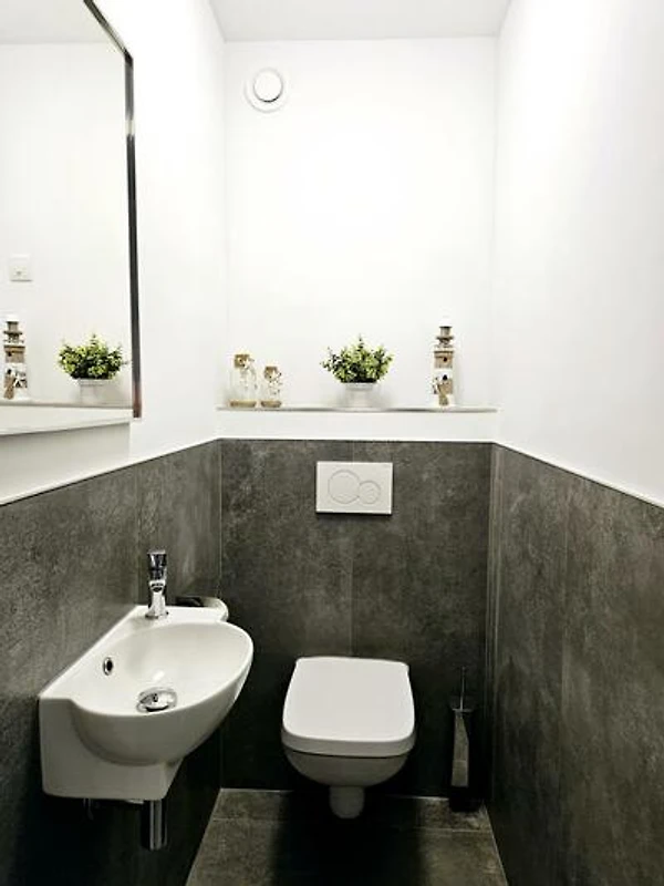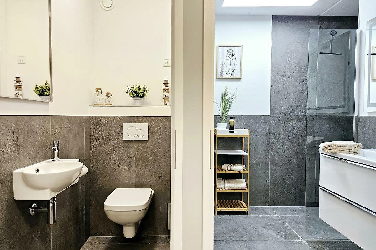 De ruime badkamer is voorzien van een douchecabine en wastafel. Daarnaast is er een separaat toilet aanwezig.