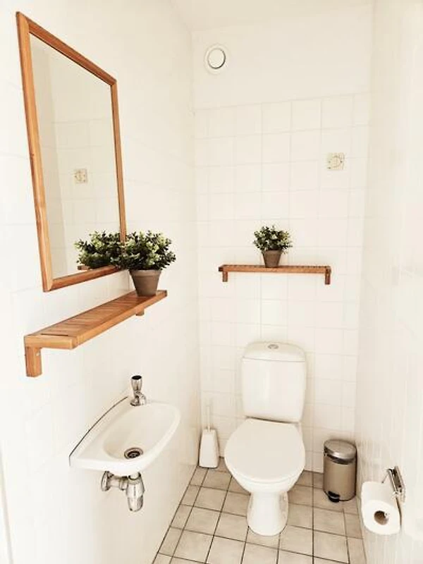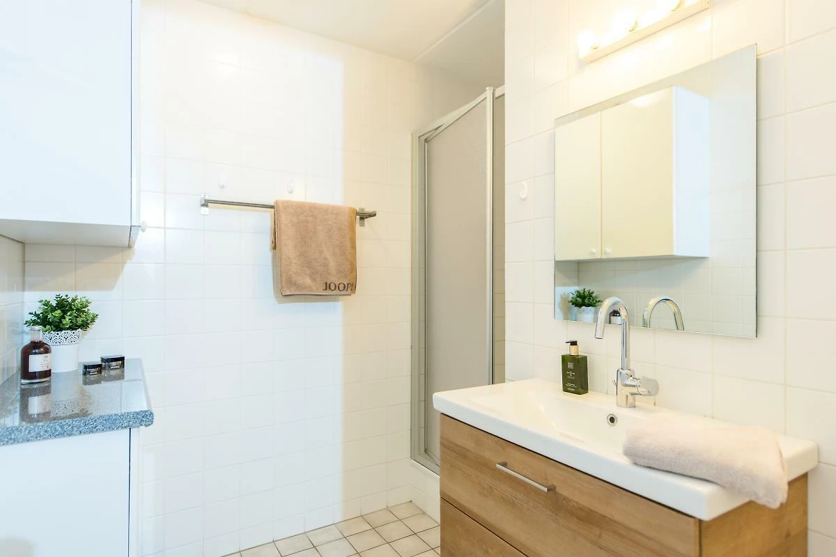 De ruime badkamer is voorzien van een douchecabine en wastafel. Daarnaast is er een separaat toilet aanwezig.
