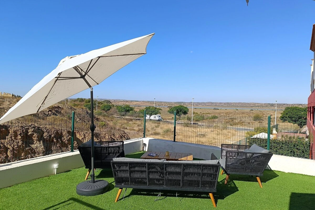 Naast Ayamonte, in een privé-urbanisatie met zwembaden voor volwassenen en kinderen, beschikt dit prachtige appartement over een terras en twee privétuinen met een ontspanningsruimte met prachtig uitzicht op de rivier.