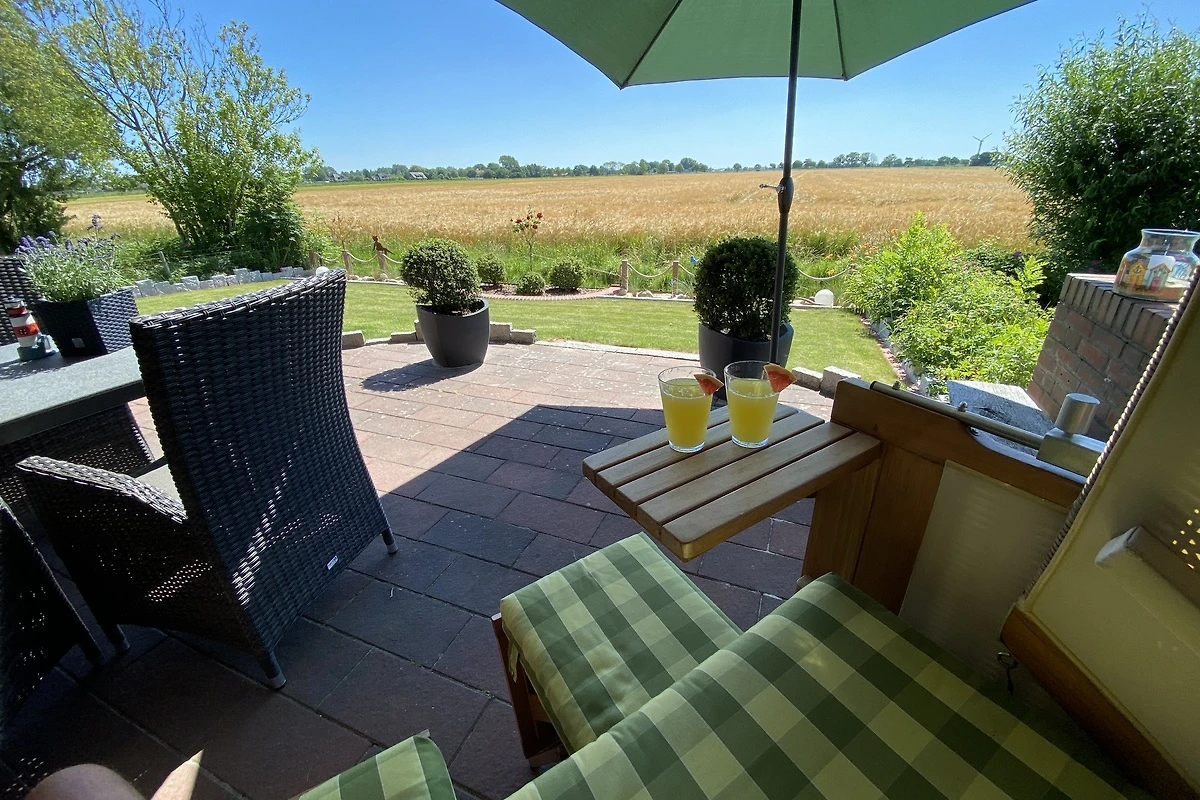 OP het terras is de strandstoel duidelijk het hoogtepunt! Ga zitten, voeten omhoog, van de zon genieten, de alledaagse beslommeringen vergeten. . . In de droomkamer op de bovenverdieping heb je een prachtig uitzicht op het veld achter het huis - zelfs vanuit het bed. Met zo'n uitzicht begin je goed aan de nieuwe vakantiedag. . .