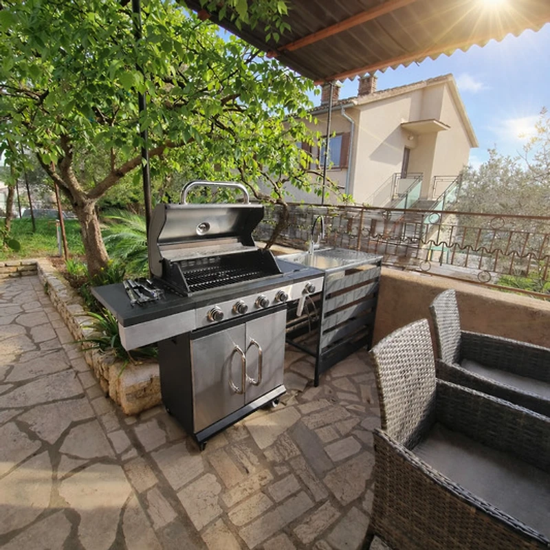 Mooi appartement met uitzicht direct op de jachthaven. Het terras is door de overkapping voorzien van schaduw. Te voet naar het strand is ongeveer 10 min. Om de hoek, dus 5 min, is er een kleine supermarkt voor alles wat je nodig hebt. De grotere supermarkten zijn met de auto in 5-7 min te bereiken. Op 150m van het appartement is er een heel leuk restaurant "Admiral" waar we erg lekker hebben gegeten. Natuurlijk moet je ook bij "Asterix" eens pizza hebben gegeten. Het appartement is zeer modern met alles wat je nodig hebt, zelfs een magnetron is aanwezig. Handdoeken en alles was voldoende aanwezig. Bij vragen waren onze verhuurders altijd zeer behulpzaam en beide zeer sympathiek (liefde groeten). Bushalte is ook om de hoek, dus van ons alleen maar aan te raden, we hebben ons zeer op ons gemak gevoeld. Parkeerplaats direct in de binnenplaats.